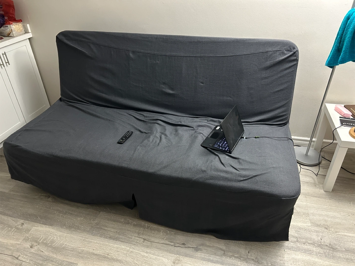 This is a dark grey sofa bed. It's got a wooden slat base for support. Could be useful for small apartments or guest rooms! Few slates are broken and taped. Can be replaced from Ikea spares. Grey cover is washable. Pet and smoke free home. Mattress has wine stains. Want to get rid off since the sitting position is not that great. Laptop is not included.