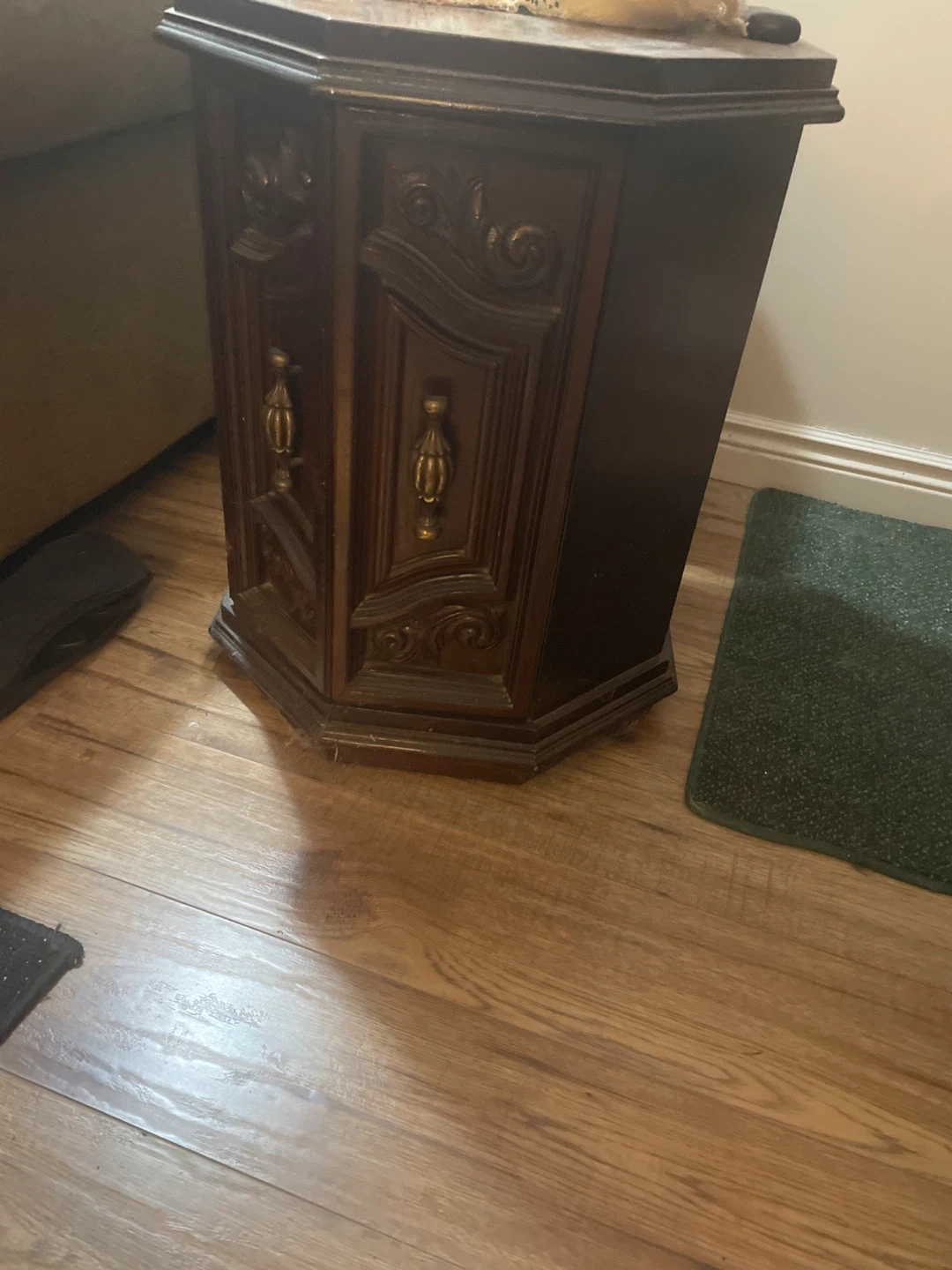 A dark wood accent table with ornate carvings and brass-toned drawer pulls. It's octagonal in shape, offering a unique design for any room. This table is great for holding lamps or decorative items.