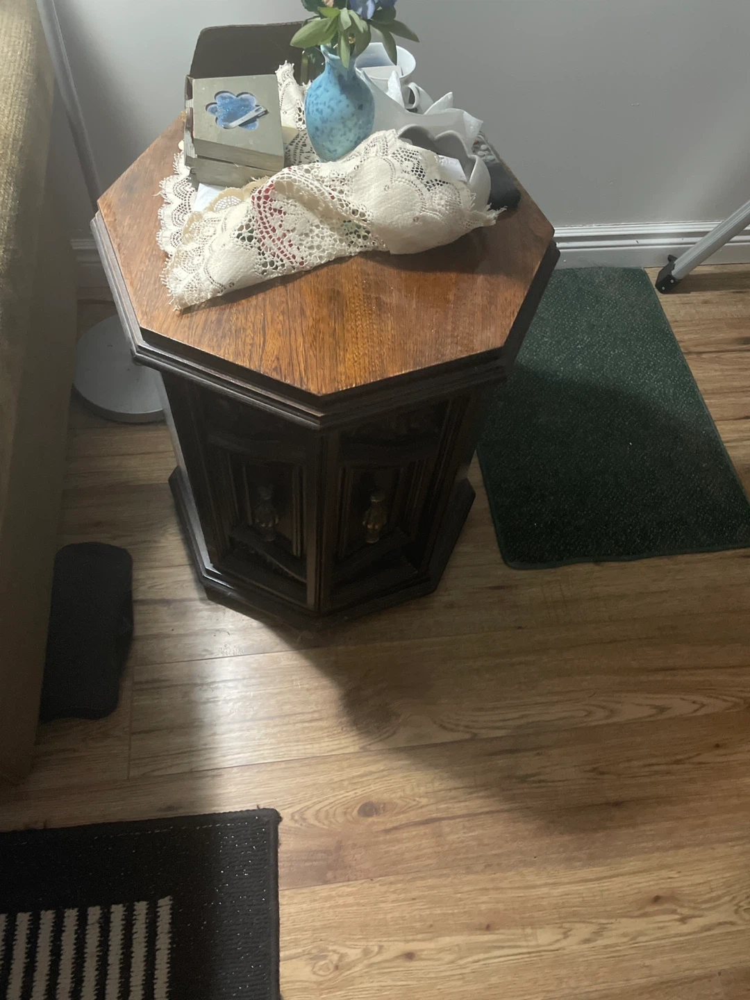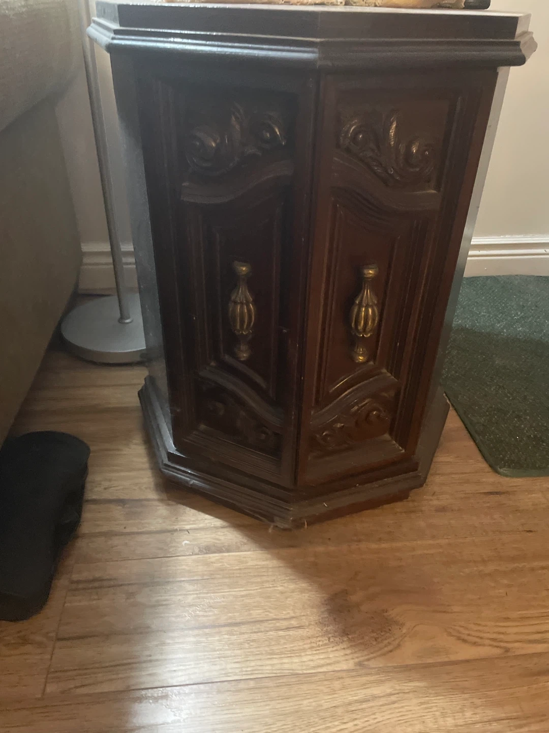 A dark wood accent table with ornate carvings and brass-toned drawer pulls. It's octagonal in shape, offering a unique design for any room. This table is great for holding lamps or decorative items.