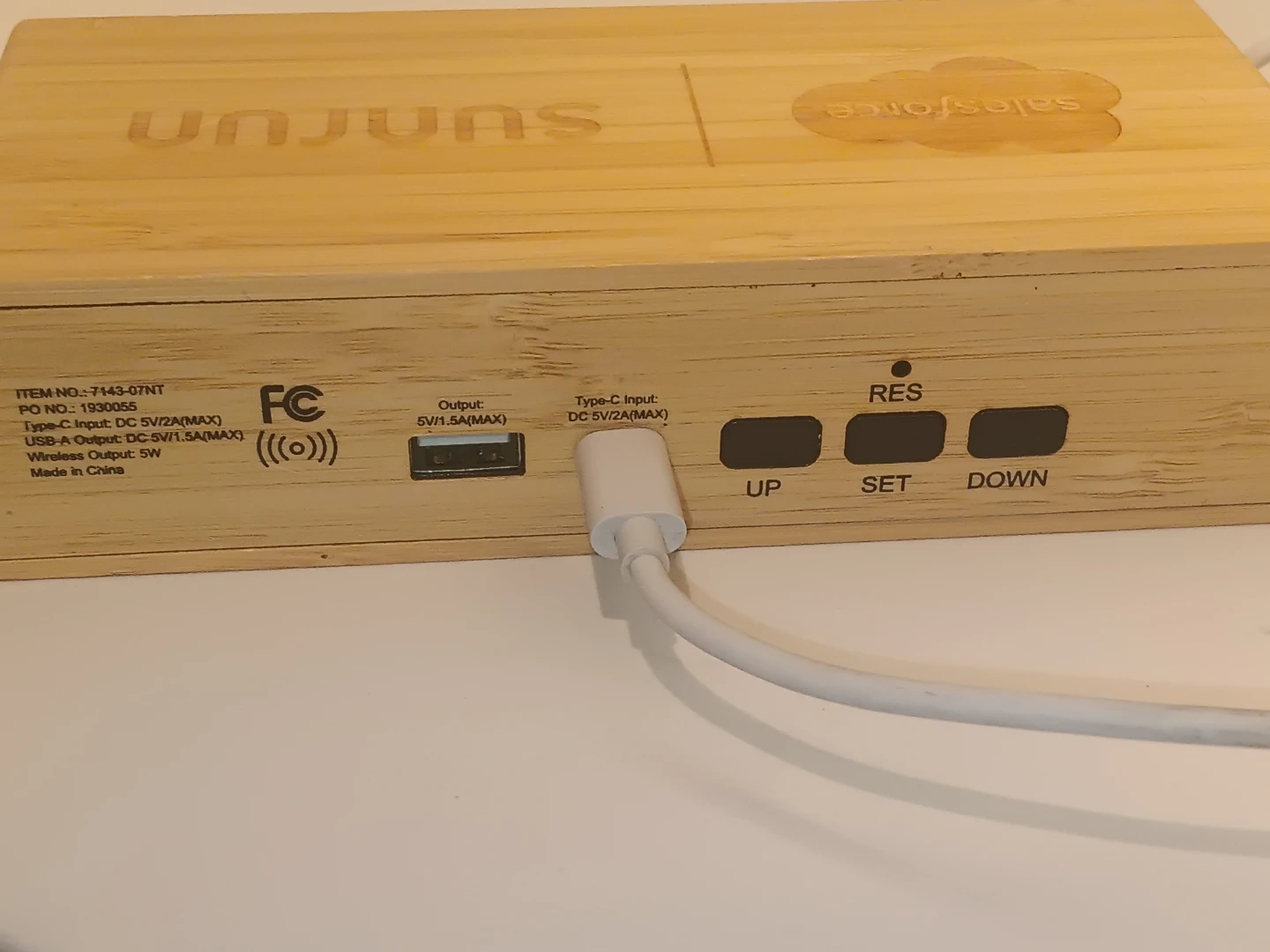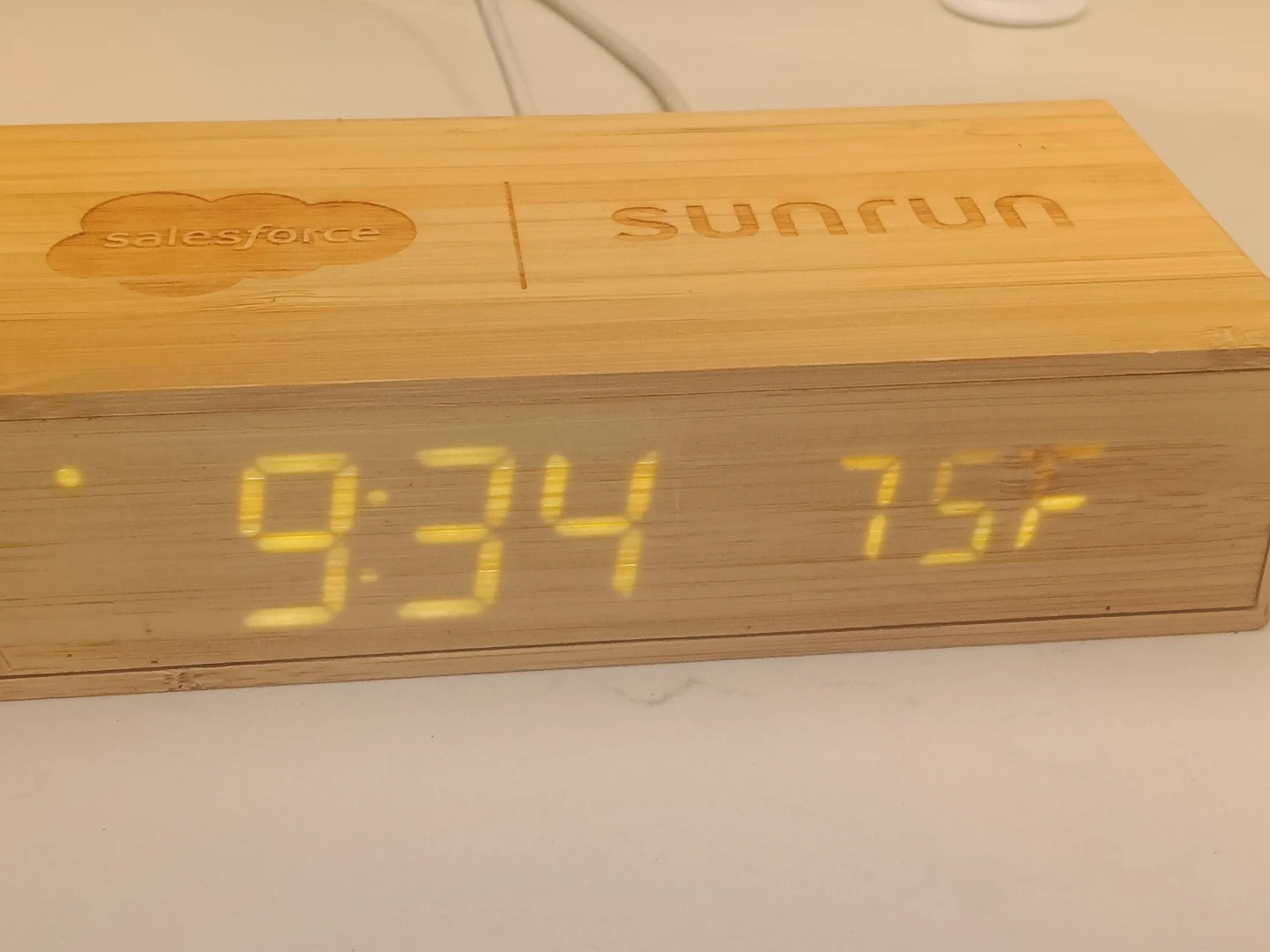 Selling a unique bamboo digital clock featuring the SunRun and Salesforce logos! It has a Type-C input (DC 5V/2A(MAX)), USB-A output (DC 5V/1.5A(MAX)), and wireless output of 5W. It also includes buttons for setting the time and date. A cool piece for any desk or nightstand!