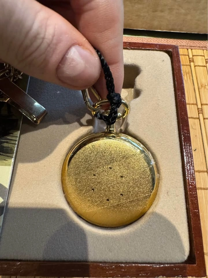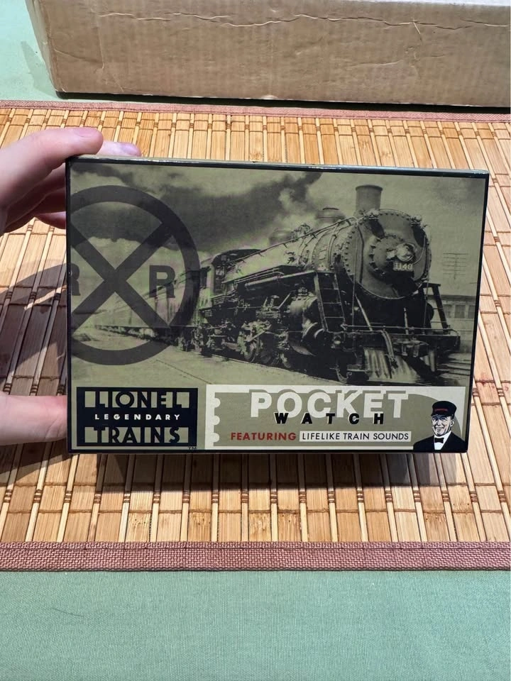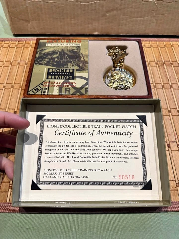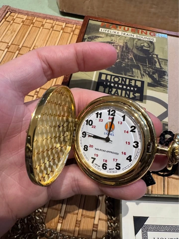 This gold-tone pocket watch features a railroad-themed design, working quartz movement, and lifelike train sound effects. A great display piece for train enthusiasts, Lionel collectors, or anyone who appreciates railroad nostalgia.