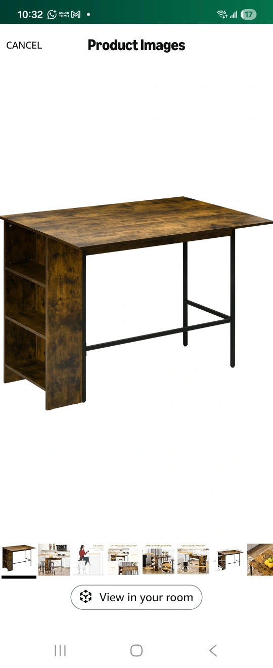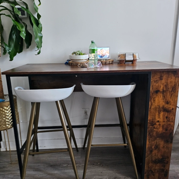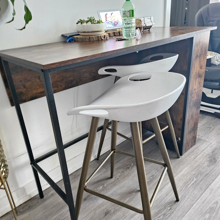 Selling a bar table with two matching stools. The table has a rustic brown finish with a black metal frame. The stools are white with gold legs. Great for a small space or kitchen nook!