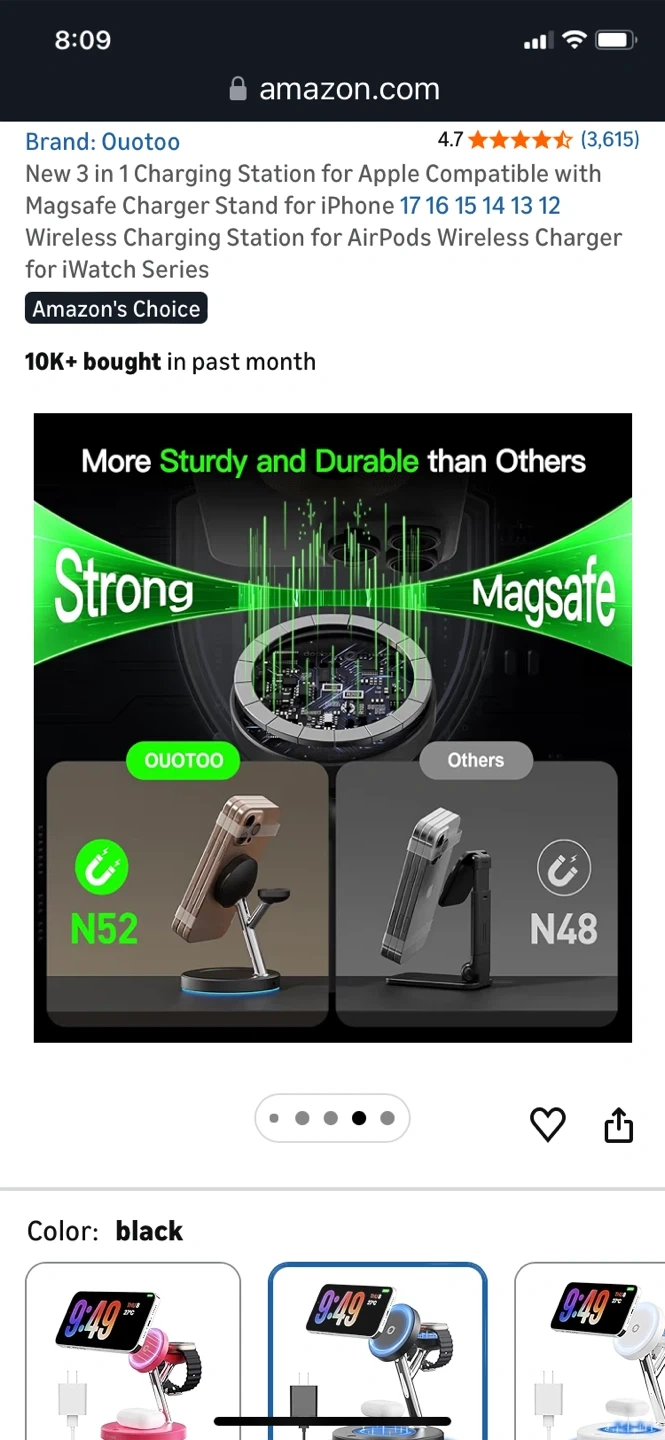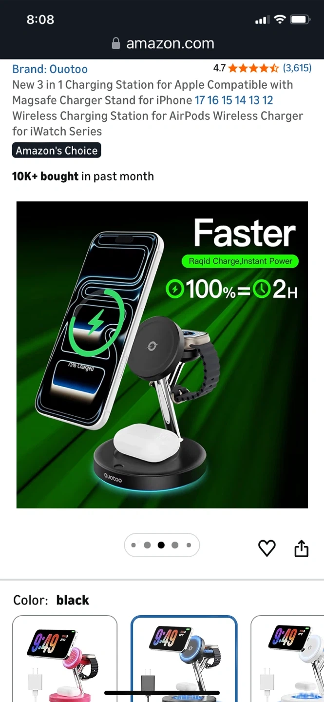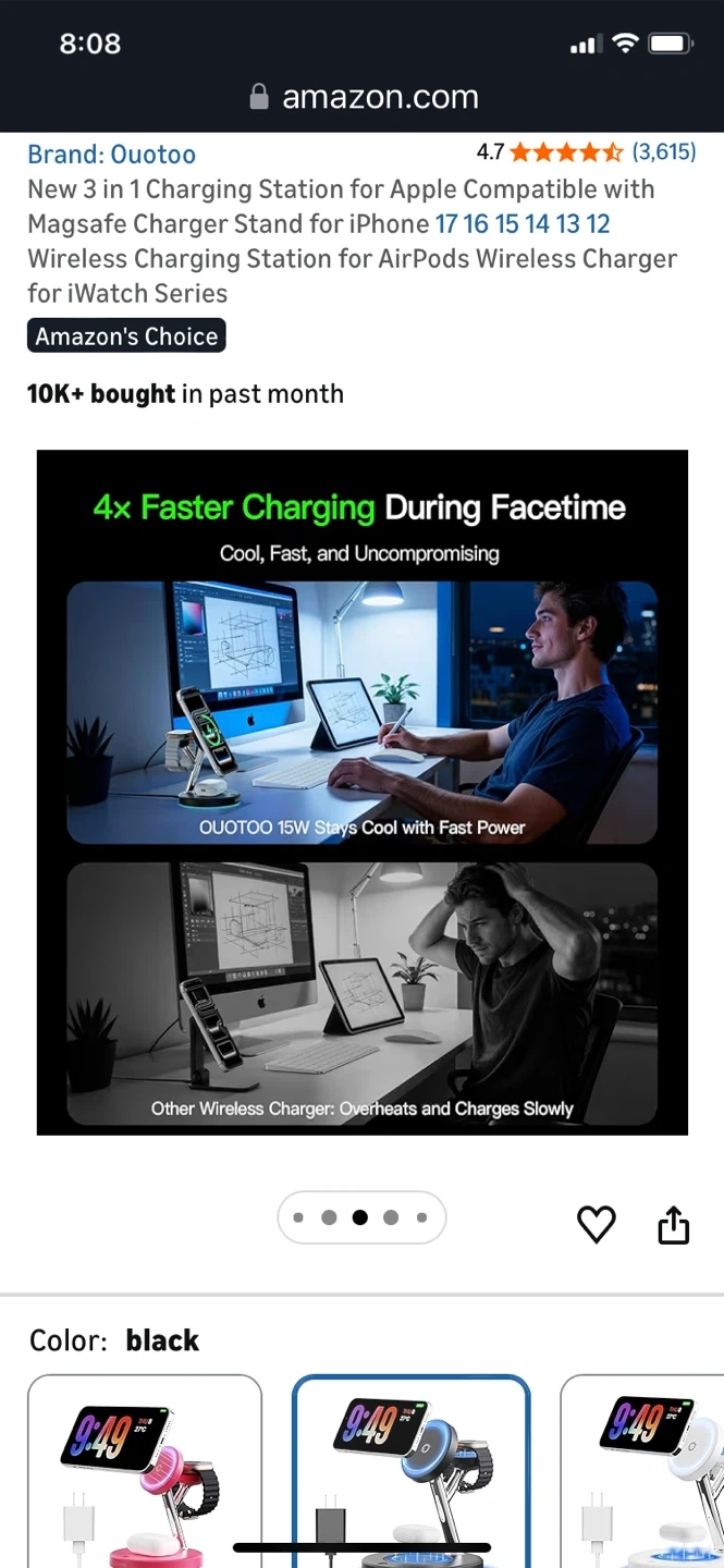 This Quotoo 3-in-1 charging station supports MagSafe for iPhone, AirPods, and Apple Watch. It features aerospace-grade TEC active cooling to keep devices from overheating. The station also offers advanced safety protection and 4x faster charging during FaceTime calls.