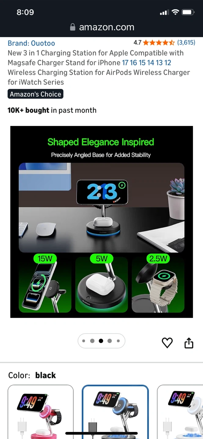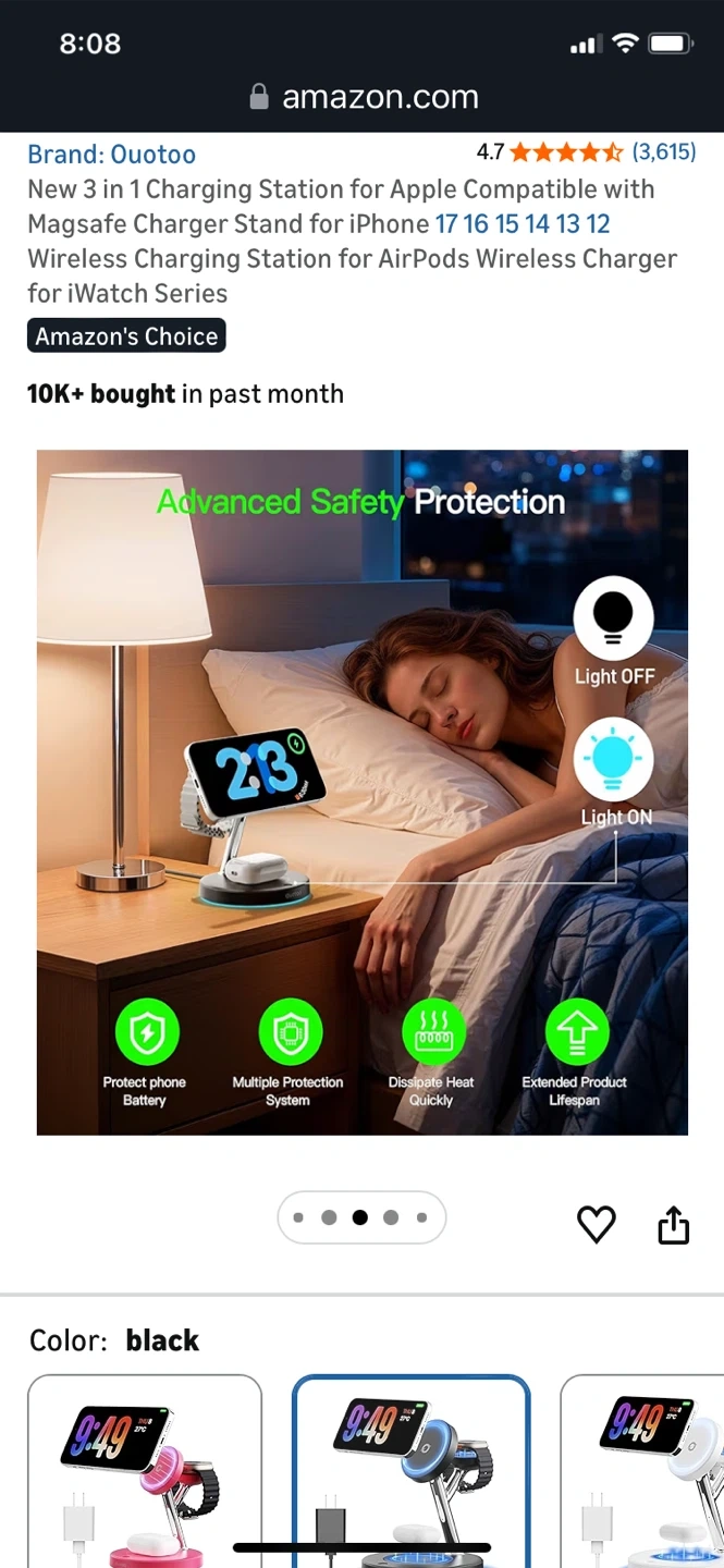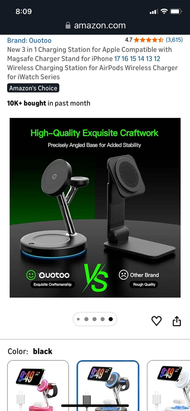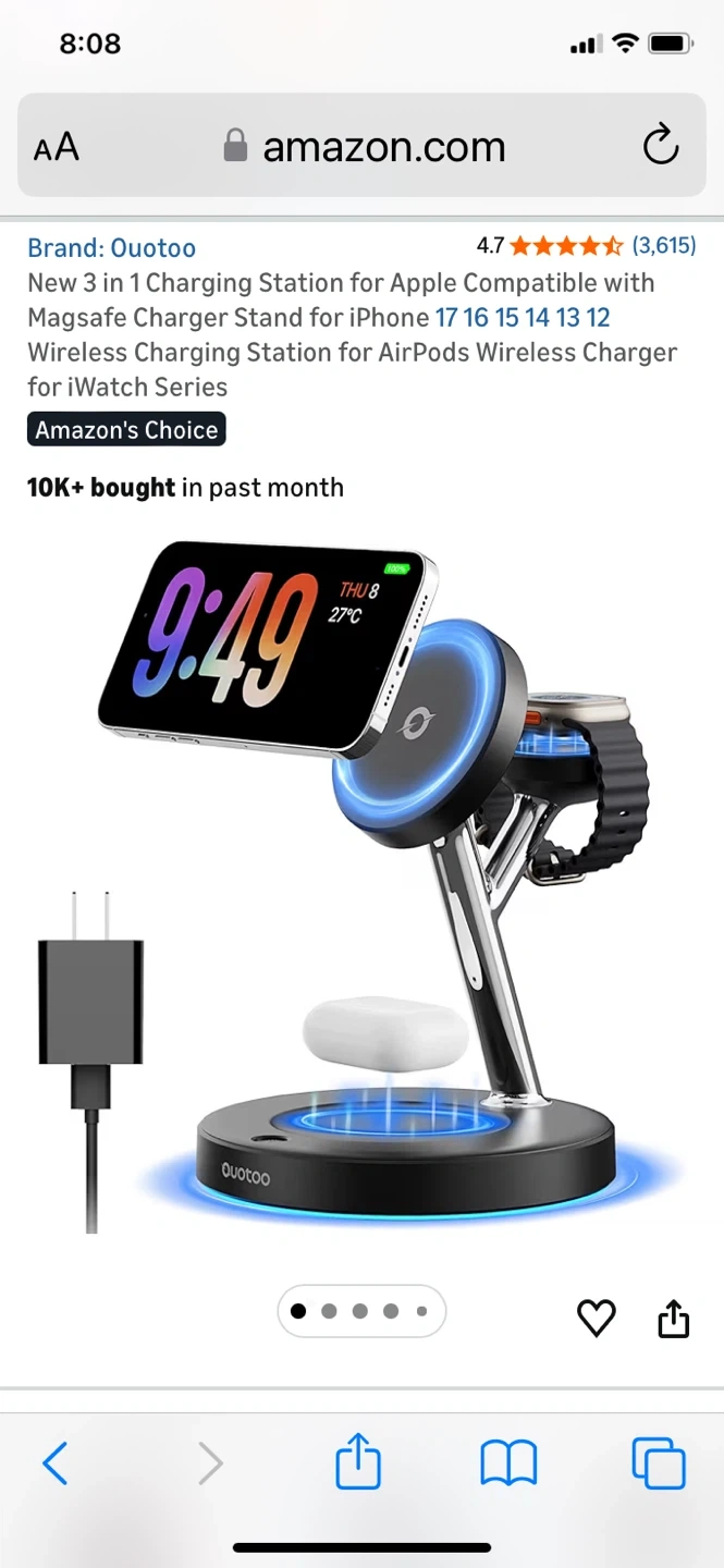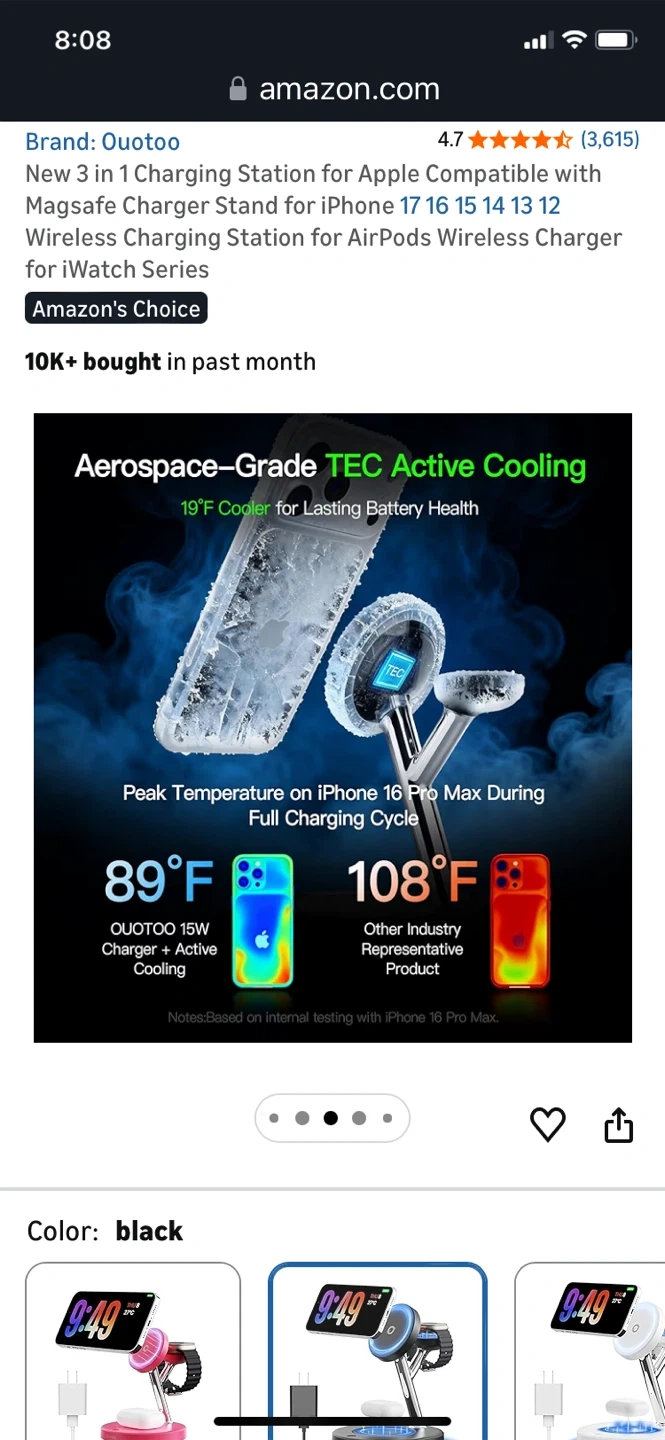 This Quotoo 3-in-1 charging station supports MagSafe for iPhone, AirPods, and Apple Watch. It features aerospace-grade TEC active cooling to keep devices from overheating. The station also offers advanced safety protection and 4x faster charging during FaceTime calls.