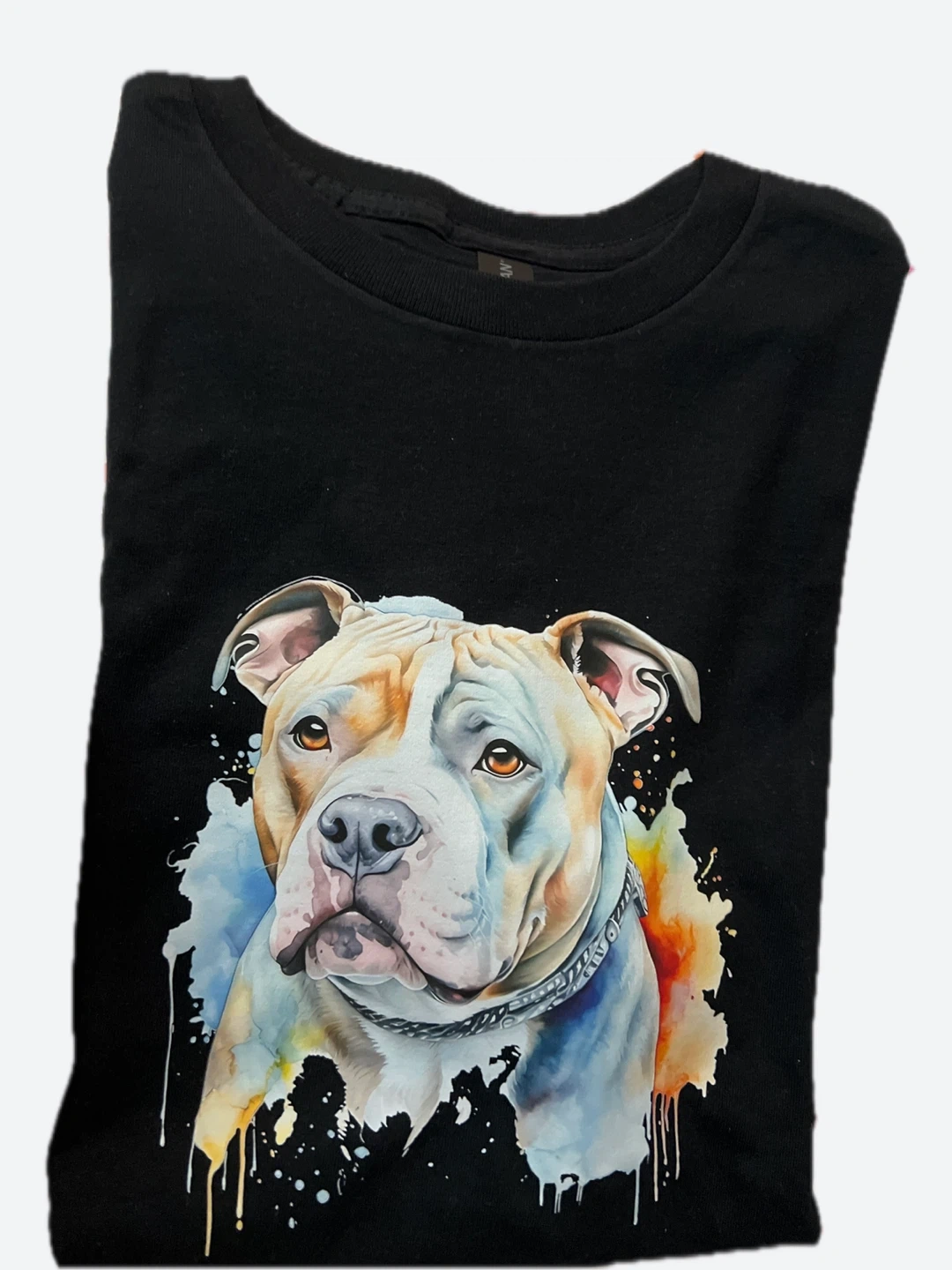 Cool black t-shirt with a vibrant watercolor-style pitbull graphic on the front. It's made of soft cotton for everyday comfort. This tee is a great statement piece for any dog lover!