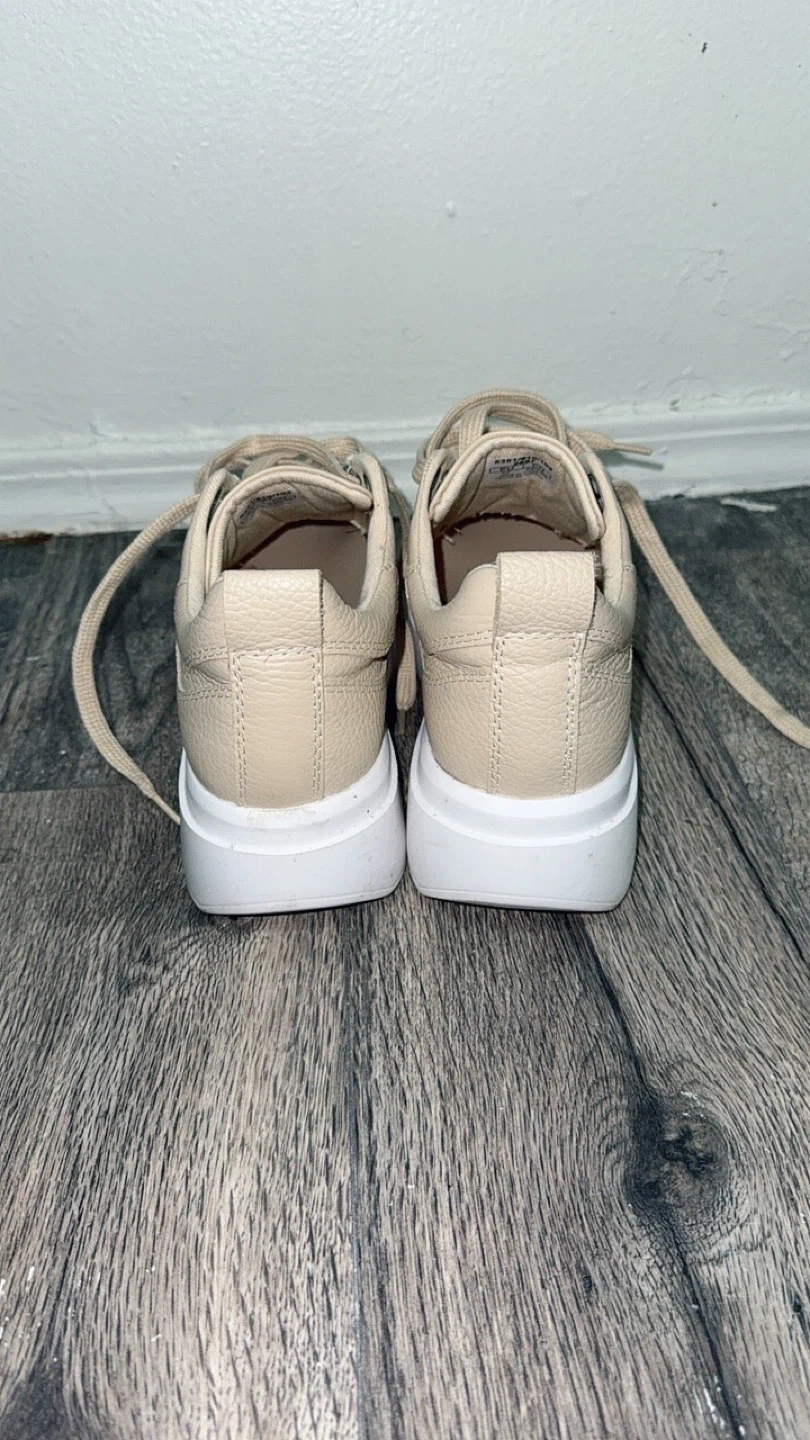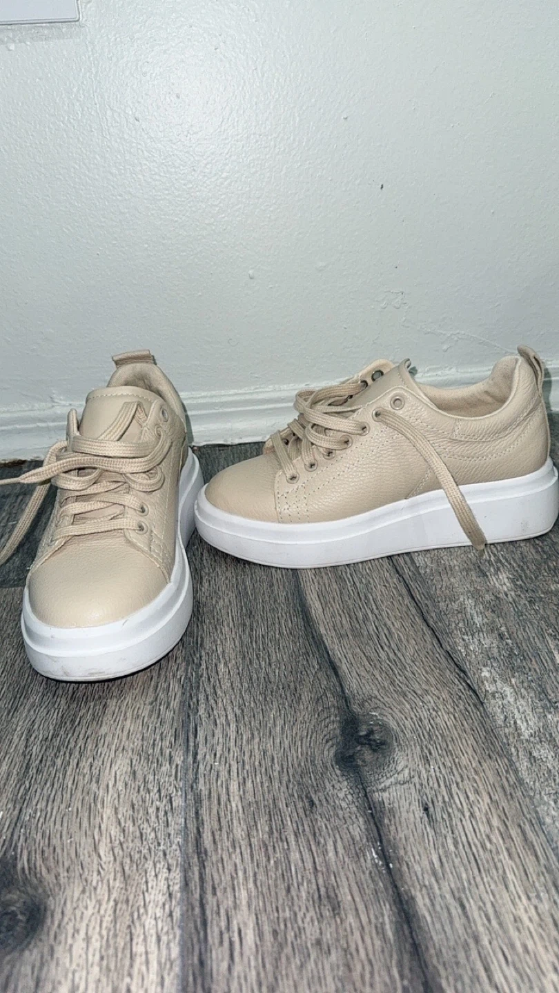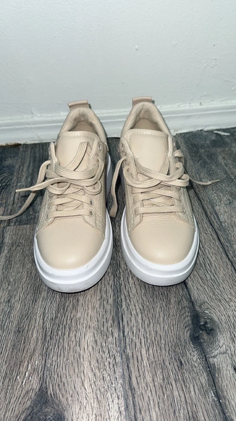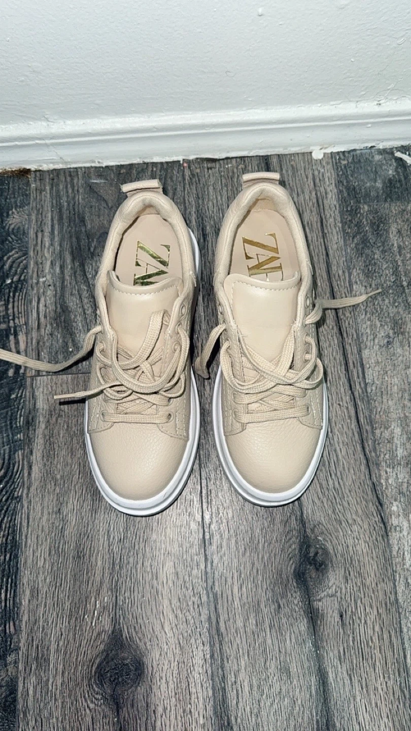 Zara tan sneakers with a textured leather upper and white platform sole. Lace-up closure. These are comfortable and stylish for everyday wear!