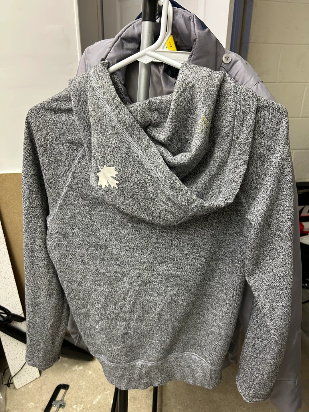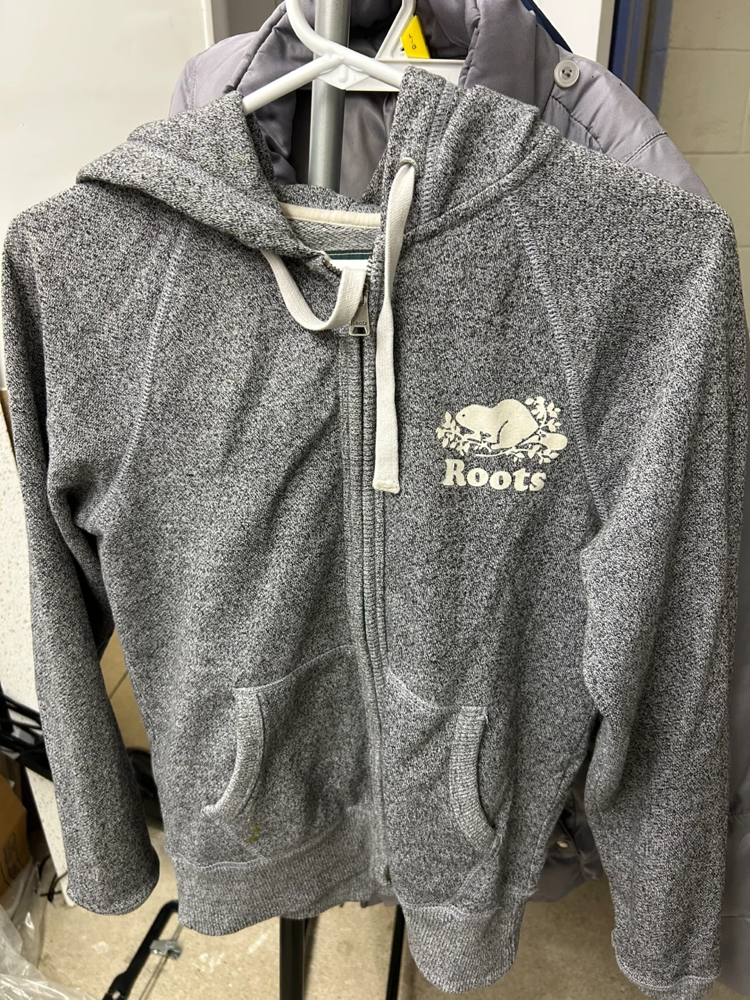 Comfy heather grey zip-up hoodie from Roots. It's a classic casual piece with a kangaroo pocket and drawstrings. Made with a soft blend, perfect for everyday wear.