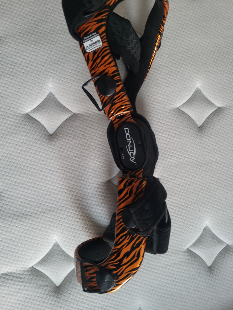 This DonJoy custom brace features a vibrant tiger stripe pattern. It's designed for support and stabilization. Adjustable straps ensure a comfortable fit.