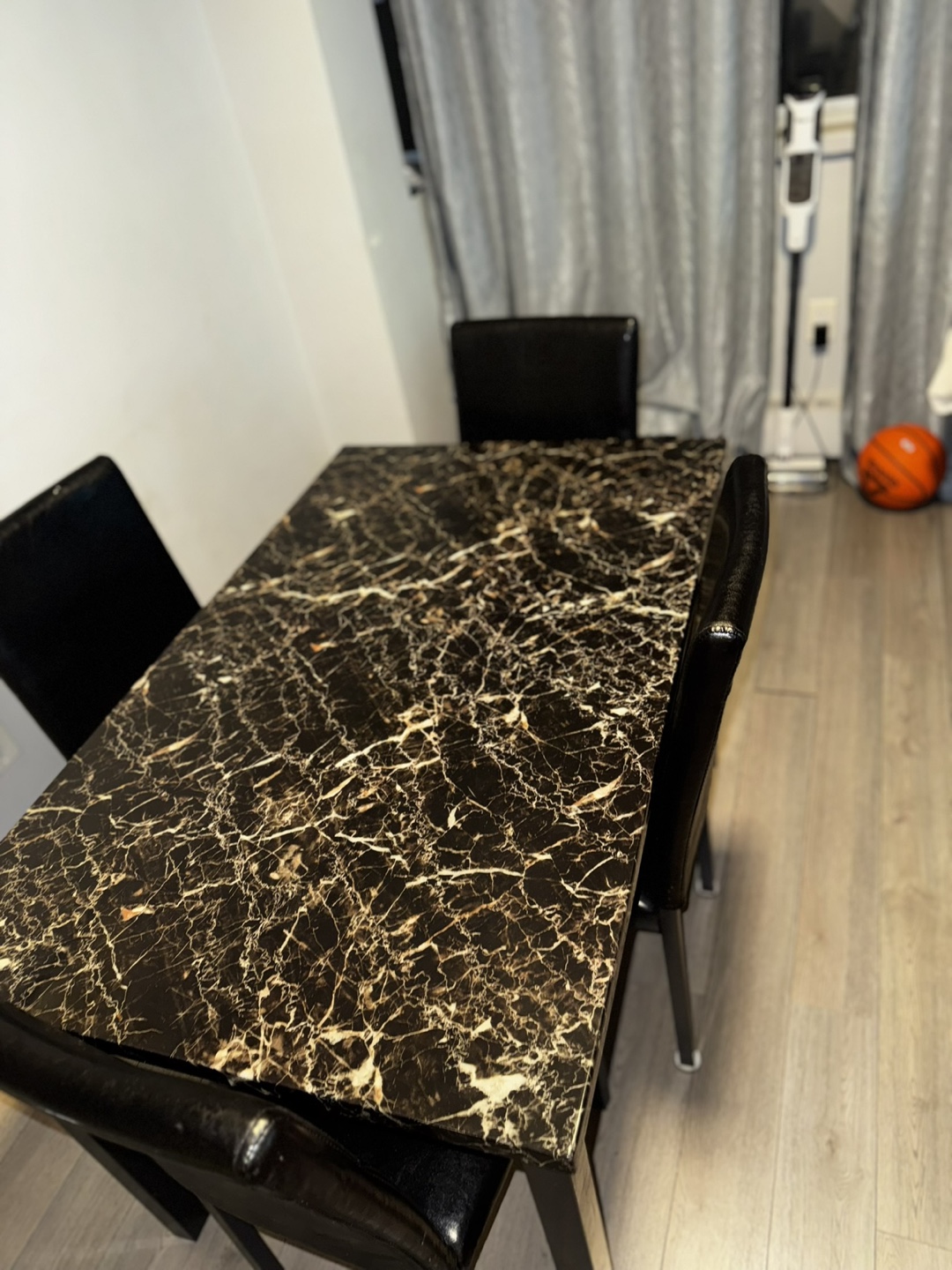 Four-chair dining set. Black faux marble table top. Black leatherette chairs. Modern style. Ideal for small spaces.