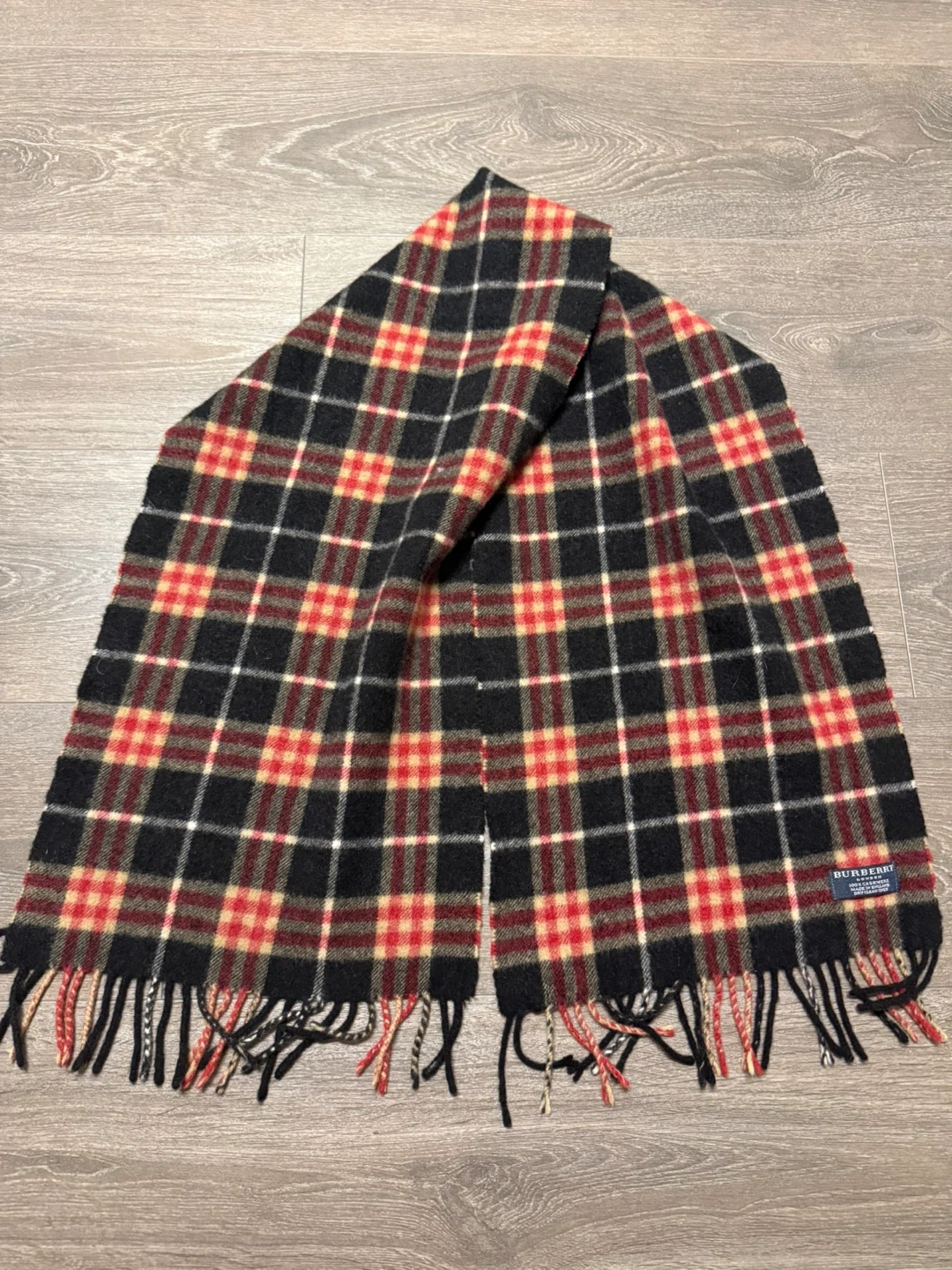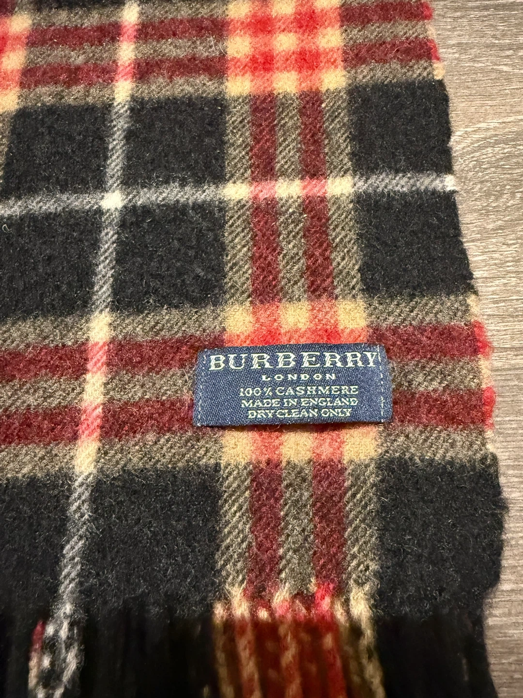 Authentic Burberry scarf is made of 100% cashmere and manufactured in England. It features the iconic Burberry plaid pattern in black, red, and beige. Dry clean only.