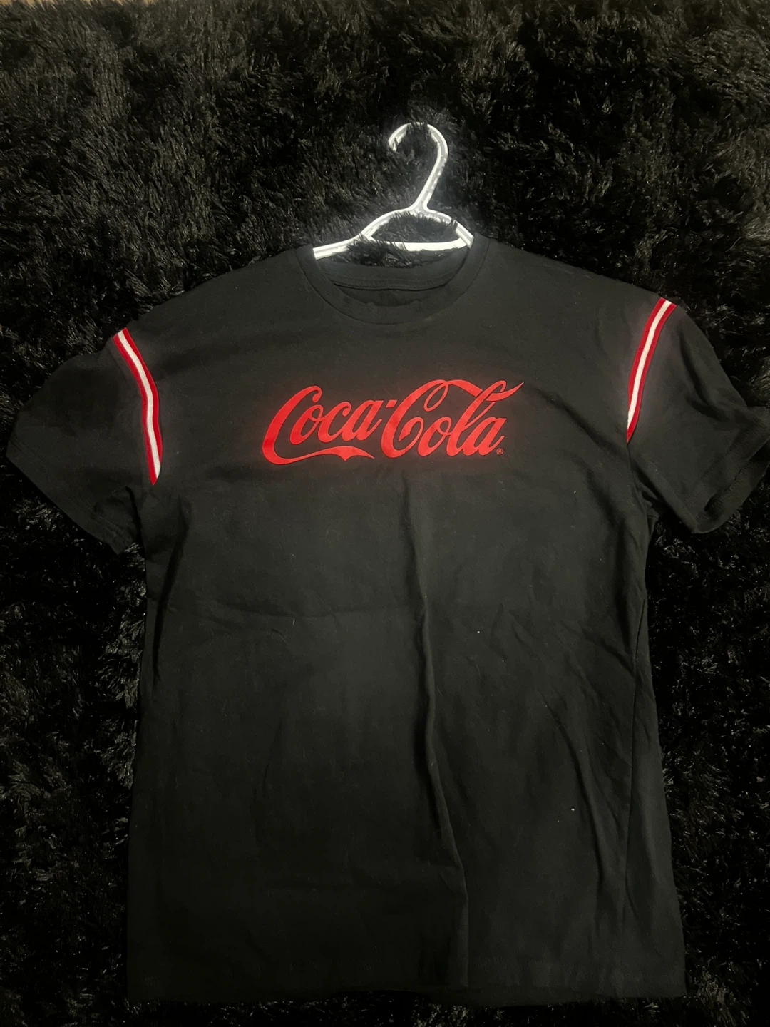 Selling a black Coca-Cola t-shirt! It has the Coca-Cola logo in red on the front and a red and white stripe detail on the sleeves. A fun and casual piece to add to your wardrobe!
