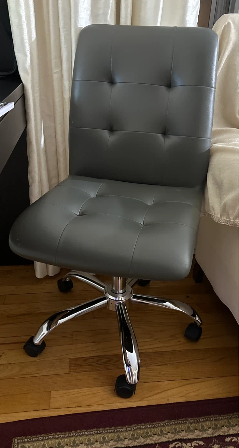 Selling a gray office chair that's in great condition! It features a comfortable, tufted seat and back, along with a chrome base with rolling casters. Perfect for your home office or study space!