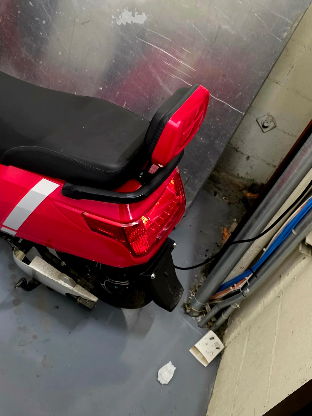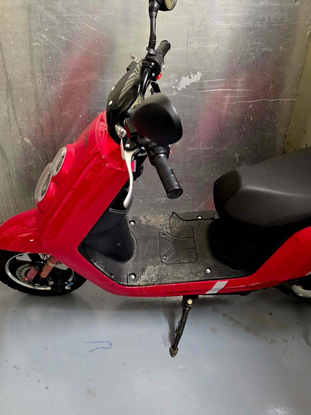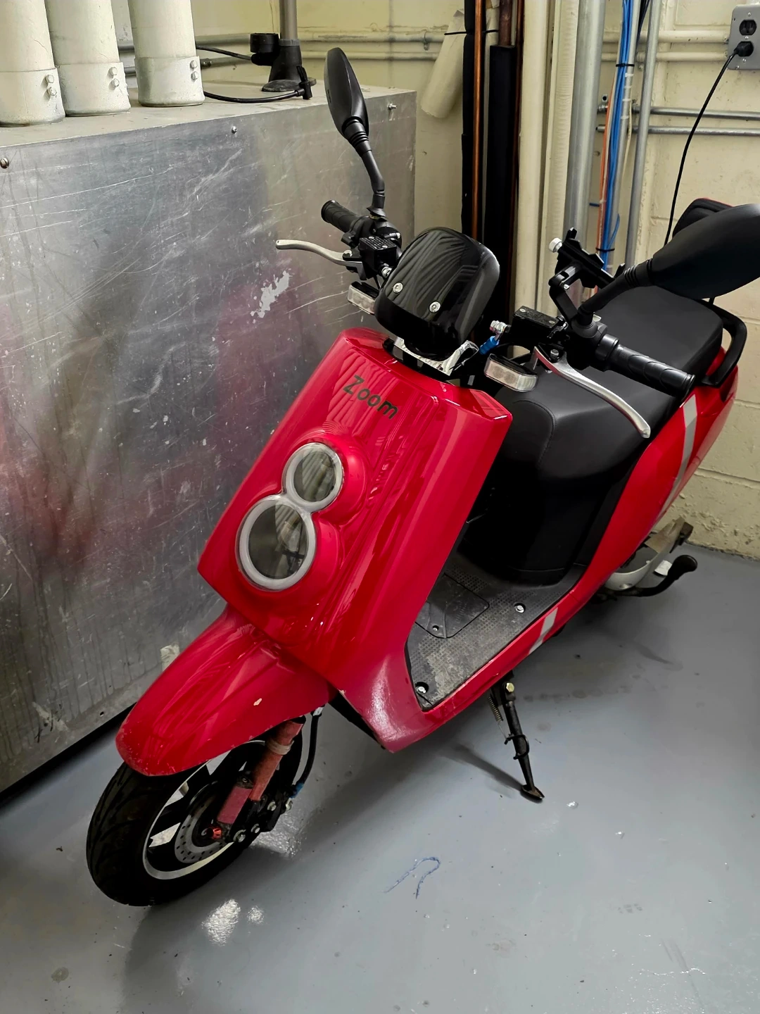 Red Zoom electric scooter with a black seat and accents, it was seldom ridden , i put a new battery system in it , It features dual headlights and a taillight. The scooter has a kickstand and mirrors. In beautiful condition , electric, up to 60 miles in one charge. Title is available.