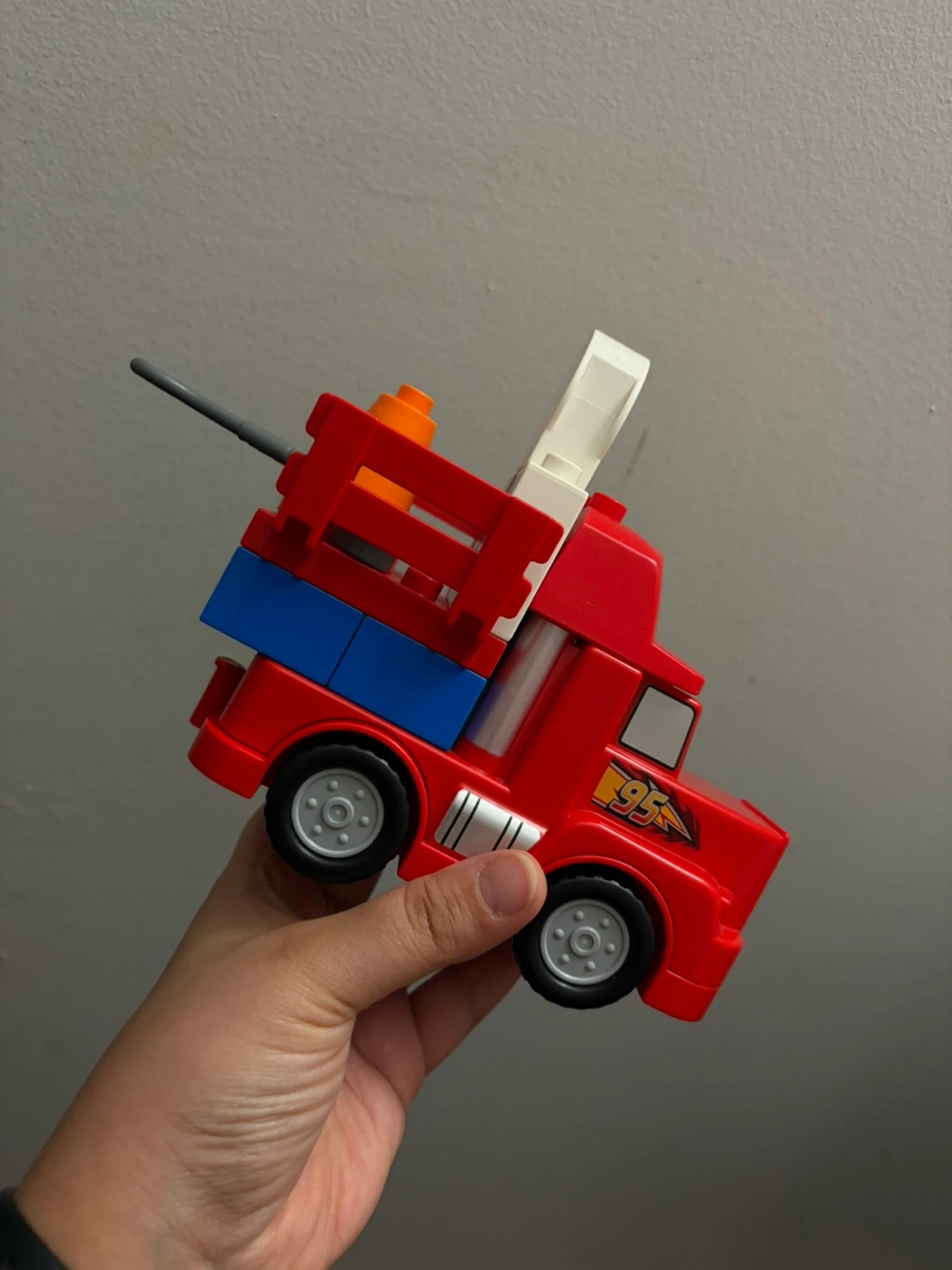 This is a red LEGO Duplo Mack truck, inspired by Disney's Cars. It has "Rust-eze" and "Mack" branding visible. Comes with attachable colourful building blocks for imaginative play!