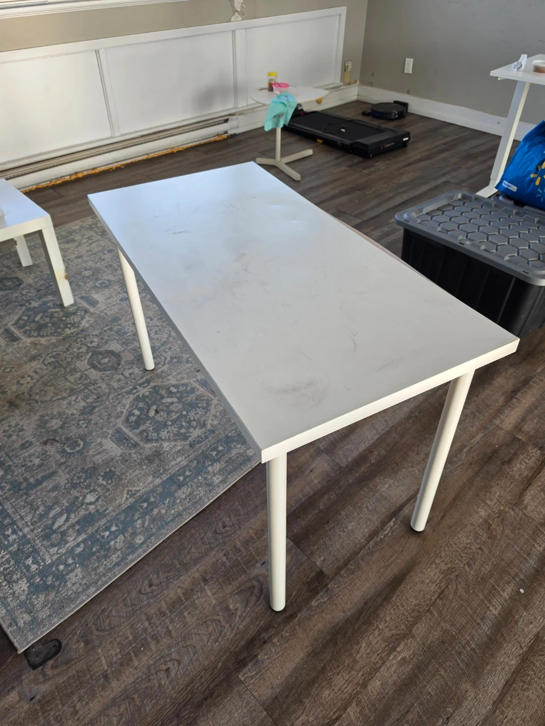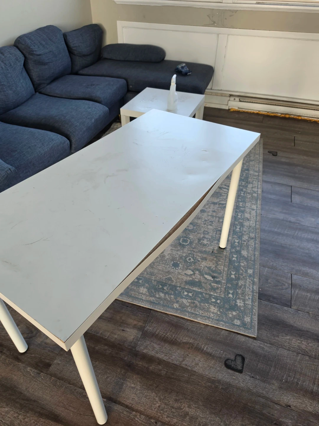 A white ikea table with white legs. It has some scuffs and a damaged edge on the side.