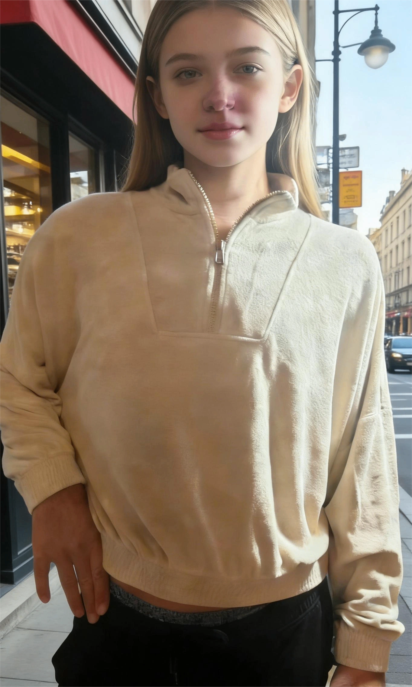 Top: Cropped half-zip, relaxed fit, looks youthful and trendy.
