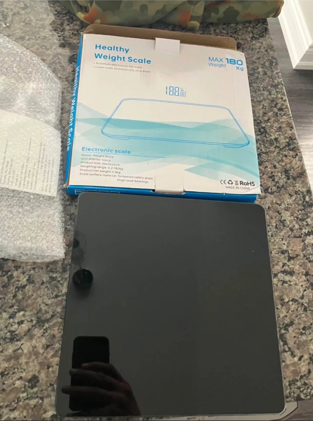 Electronic scale with tempered safety glass surface. It has a weighing range of 0.2-180kg and a product size of 26x26x2cm. This scale automatically turns on and shuts down.