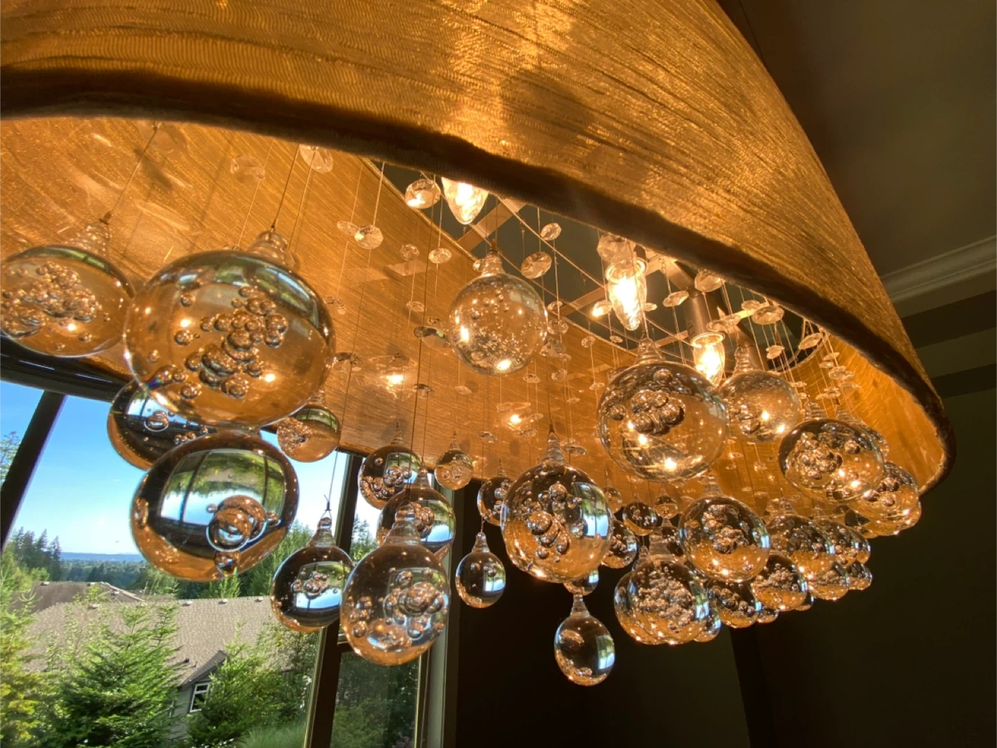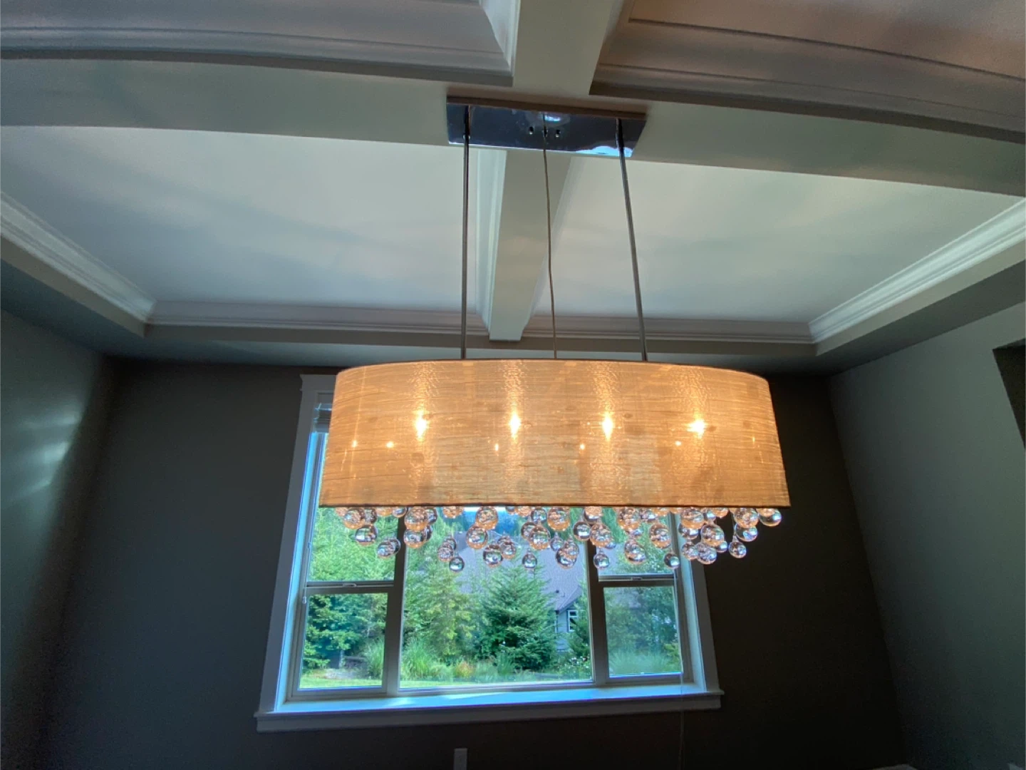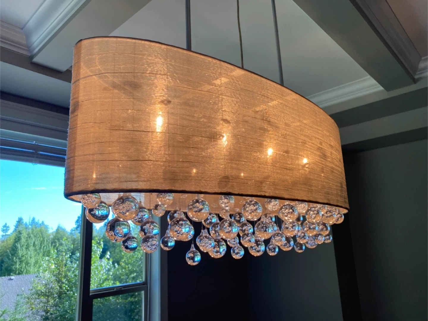 This stylish pendant light features a textured drum shade in a neutral tone. It's adorned with clear glass bubble-like accents for a touch of sparkle. It has four bulbs and would be great over a dining table or kitchen island.