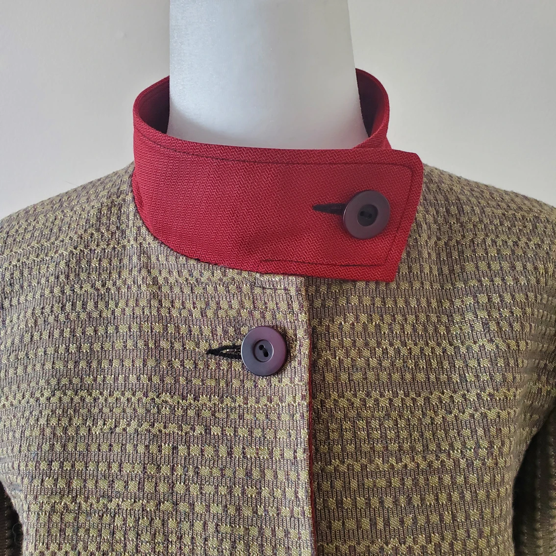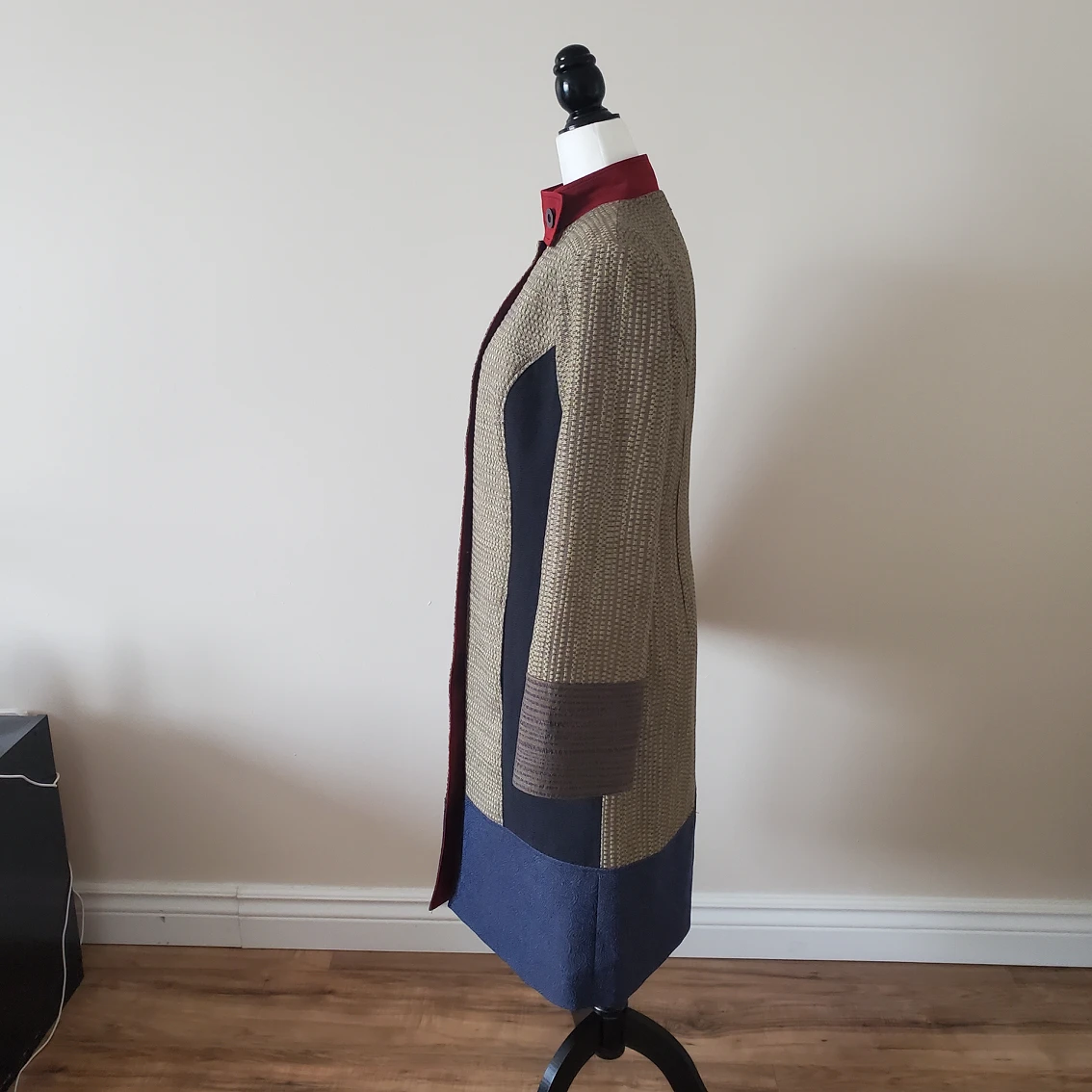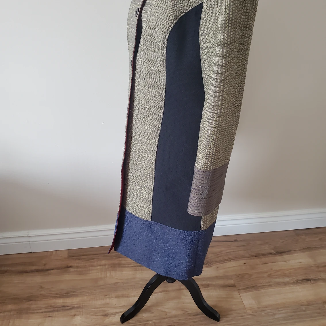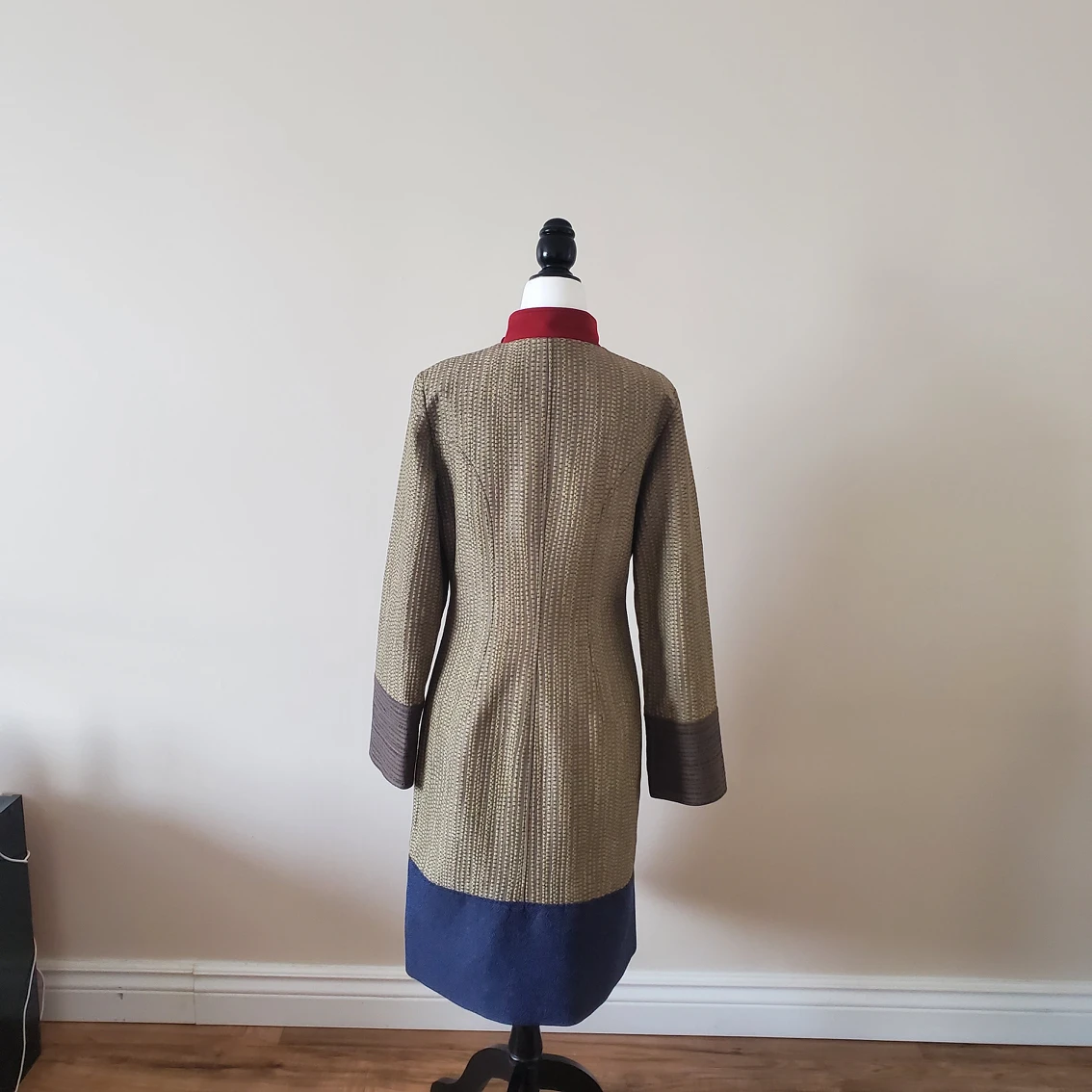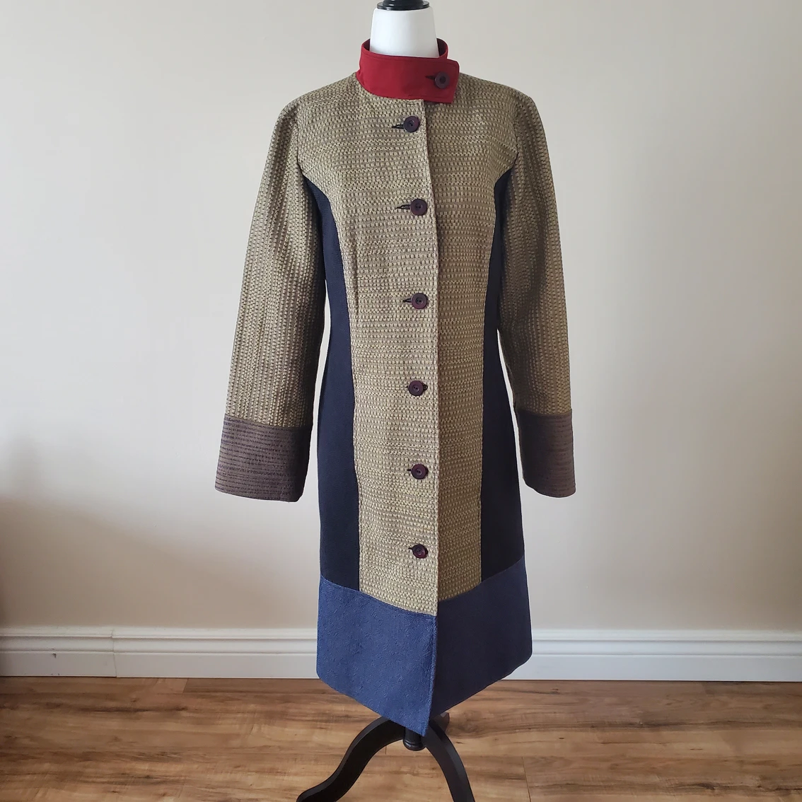 Own a statement piece designed by Annie Thompson, one of Canada’s most revered fashion designers, winner of the Vanguard Award for Sustainability in Canadian Fashion. All her pieces are either custom made or created in very limited quantities, carefully crafted and made with sustainable materials. Beautiful mix of materials, patterns and colors, a true piece of art that will set you apart from everyone else. Brand: Annie Thompson Original price: $1,200 Made in: Canada Size: 8 Color: Gold/tan, blue, brown, red Material: 70% polyester, 30% viscose Condition: Excellent, like new Pit to pit: 19 in Shoulder to shoulder: 15 in Sleeve length from the tip of the shoulder: 24 in Sleeve width: 14 in Waist: 34 in Length: 39.5 in Available for pick up near Farm Boy Newmarket.
