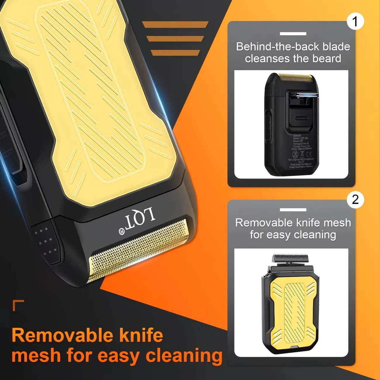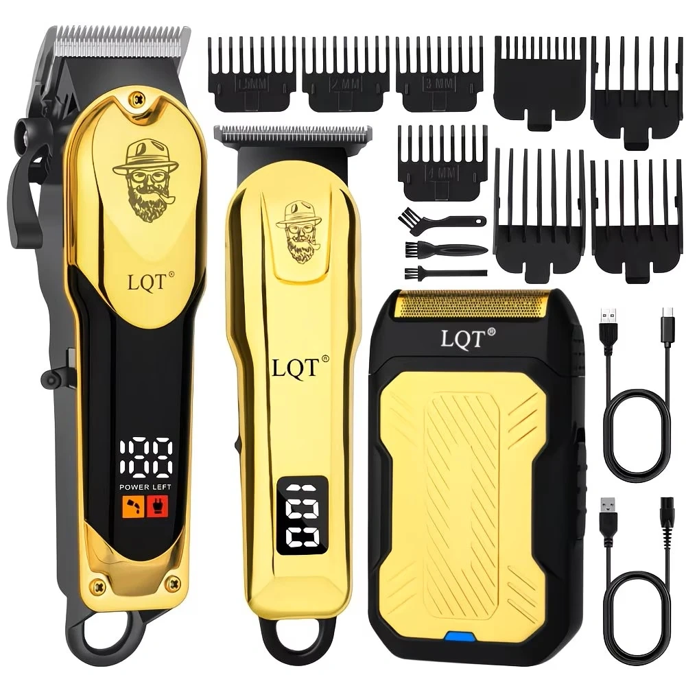 This LQT three-piece barber set includes a hair clipper, a trimmer, and a shaver. The hair clipper has a 2000mAh battery and charges in 2.5 hours. The trimmer and shaver both have 600mAh batteries and charge in 1.5 hours. It's a rechargeable set with USB charging capability. This set meets all your barber and shaving needs!