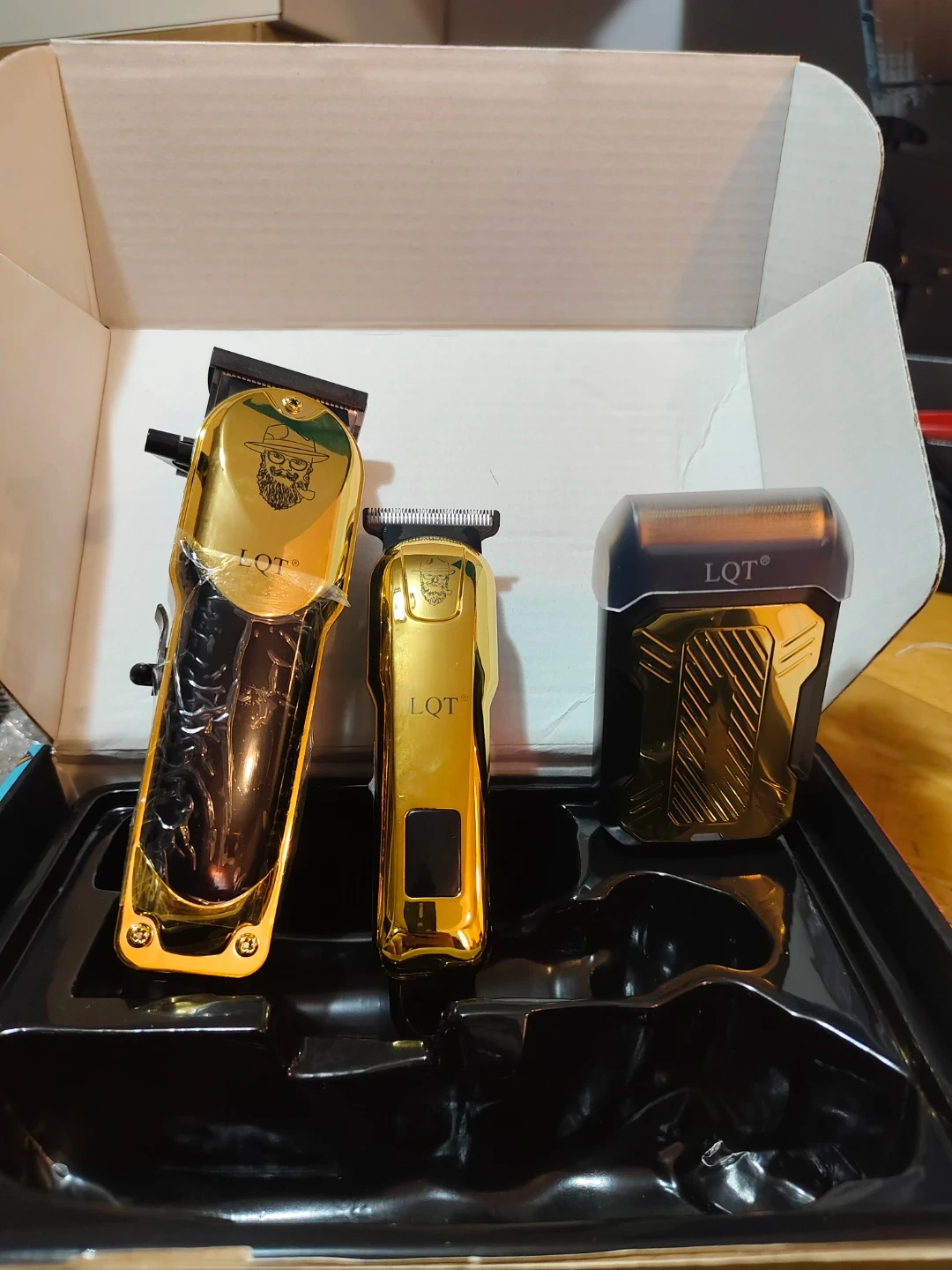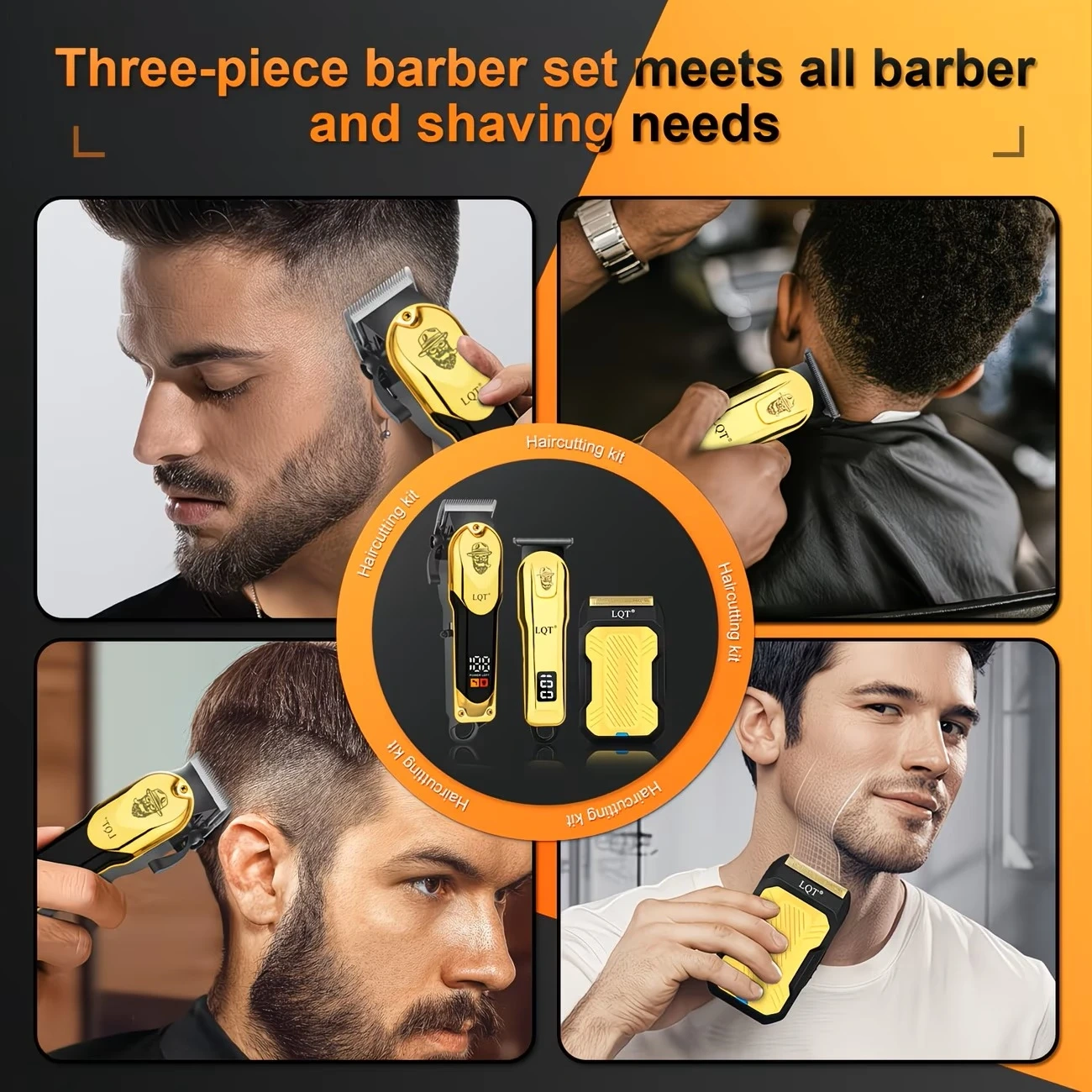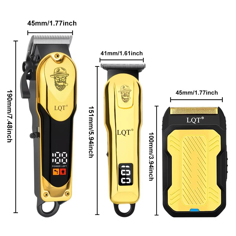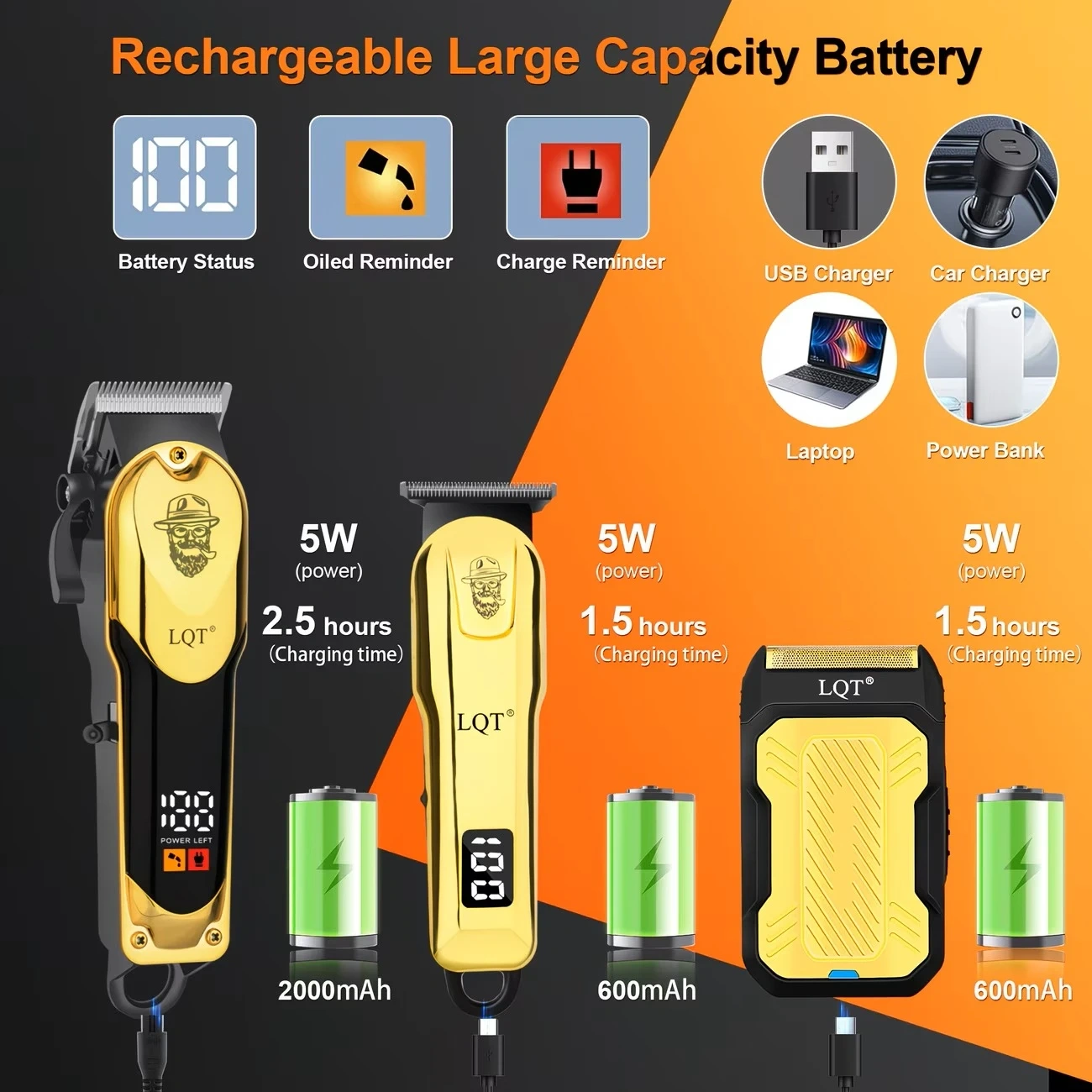 This LQT three-piece barber set includes a hair clipper, a trimmer, and a shaver. The hair clipper has a 2000mAh battery and charges in 2.5 hours. The trimmer and shaver both have 600mAh batteries and charge in 1.5 hours. It's a rechargeable set with USB charging capability. This set meets all your barber and shaving needs!
