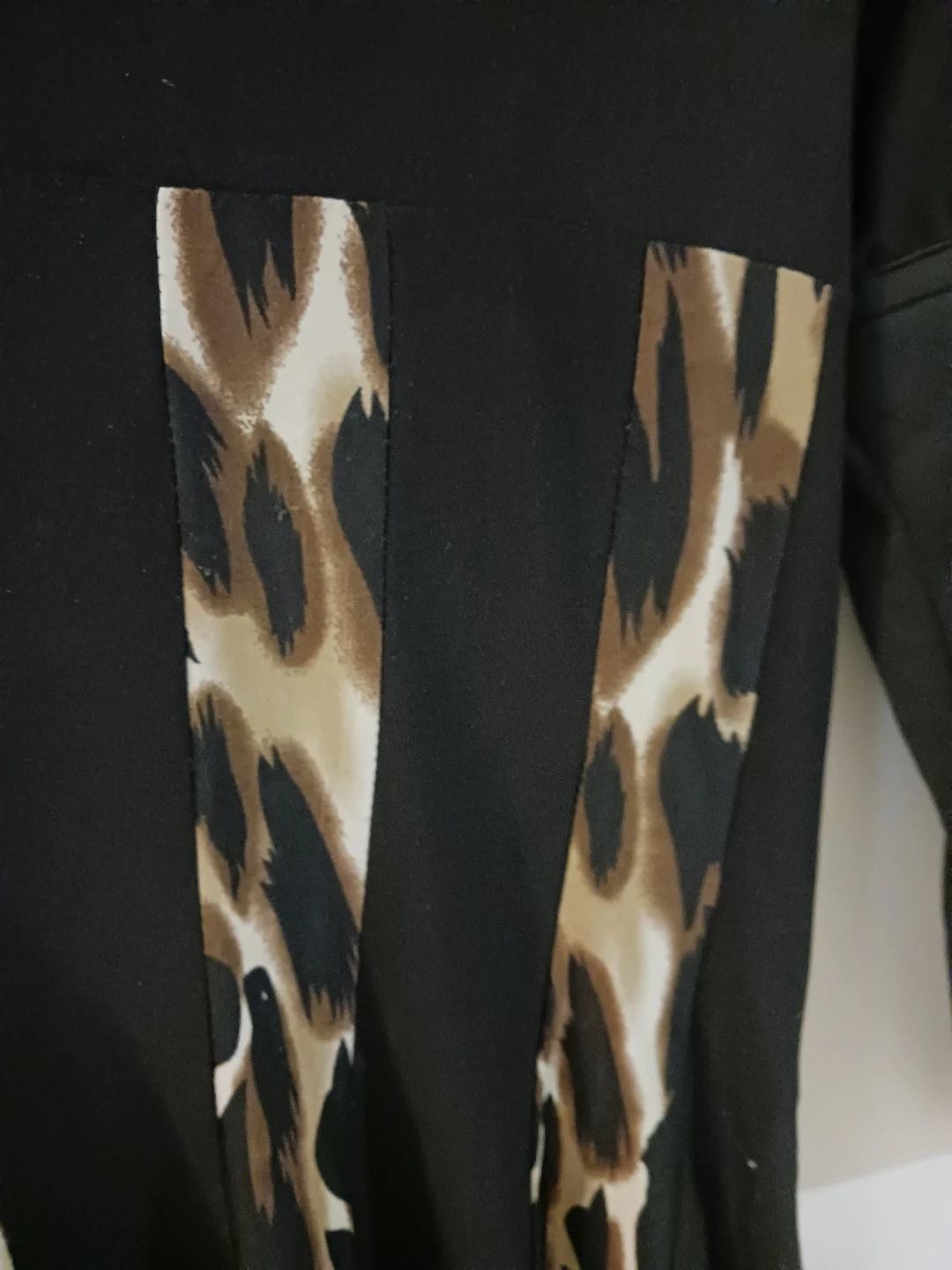 This black dress features vertical leopard print panels. It's a stylish piece for various occasions. Three-quarter sleeves.