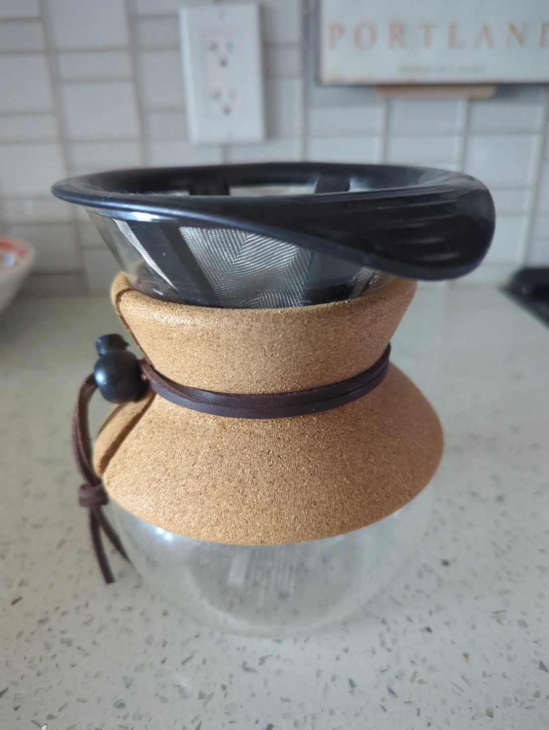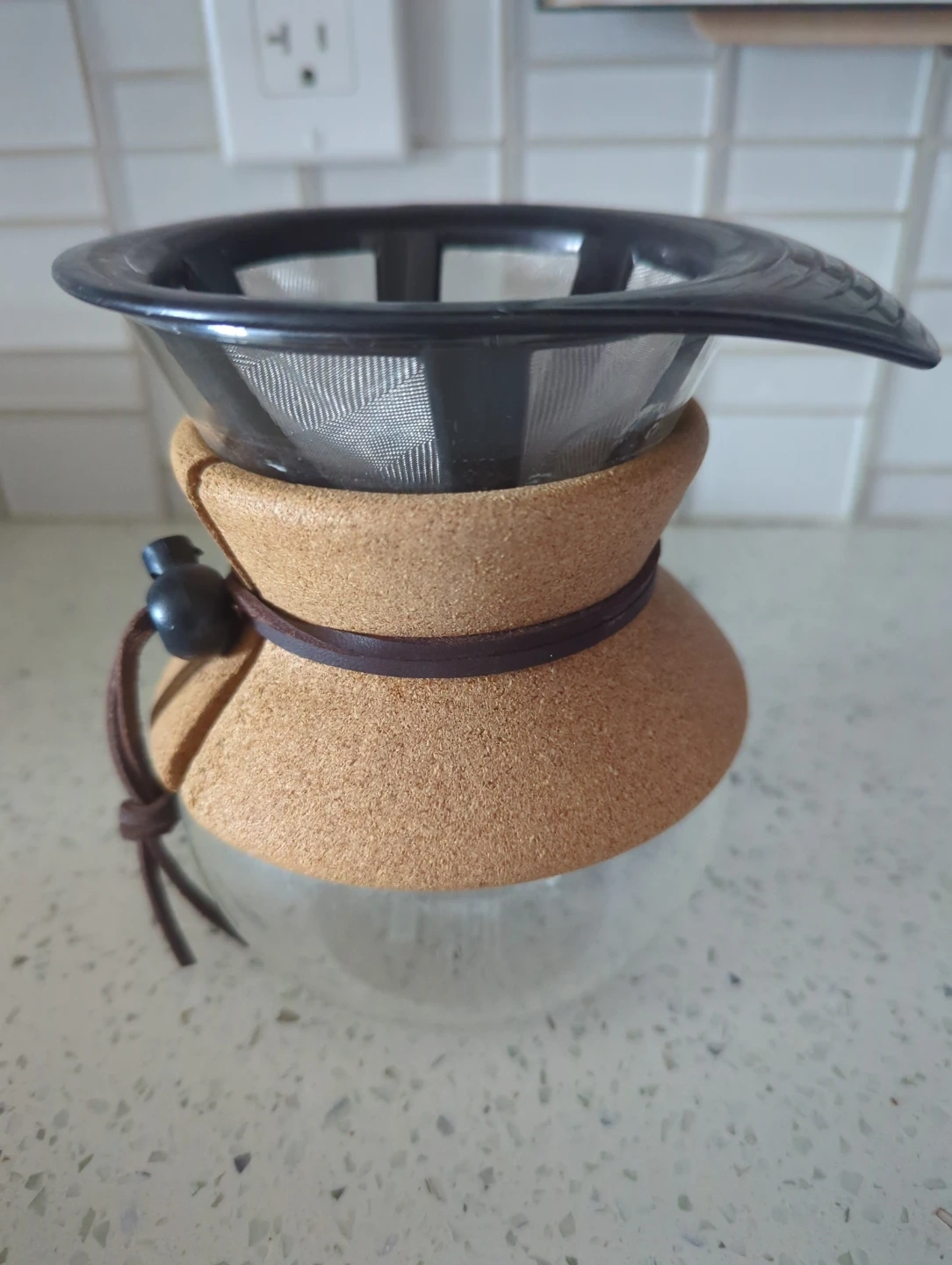 This pour-over coffee maker features a durable glass carafe with a natural cork sleeve for insulation and grip. It includes a fine mesh metal filter, eliminating the need for paper filters. A leather strap and bead accent add a stylish touch.
