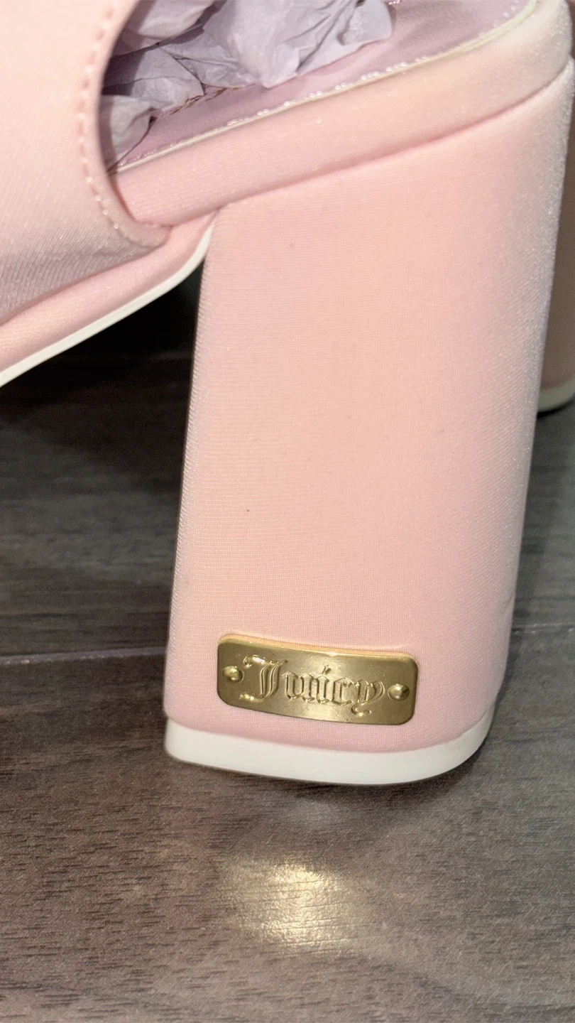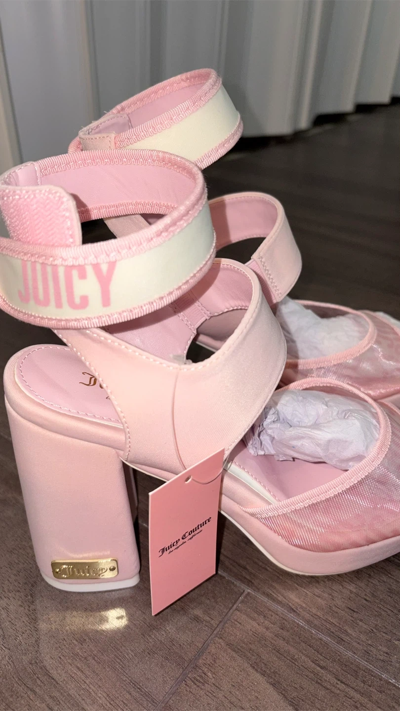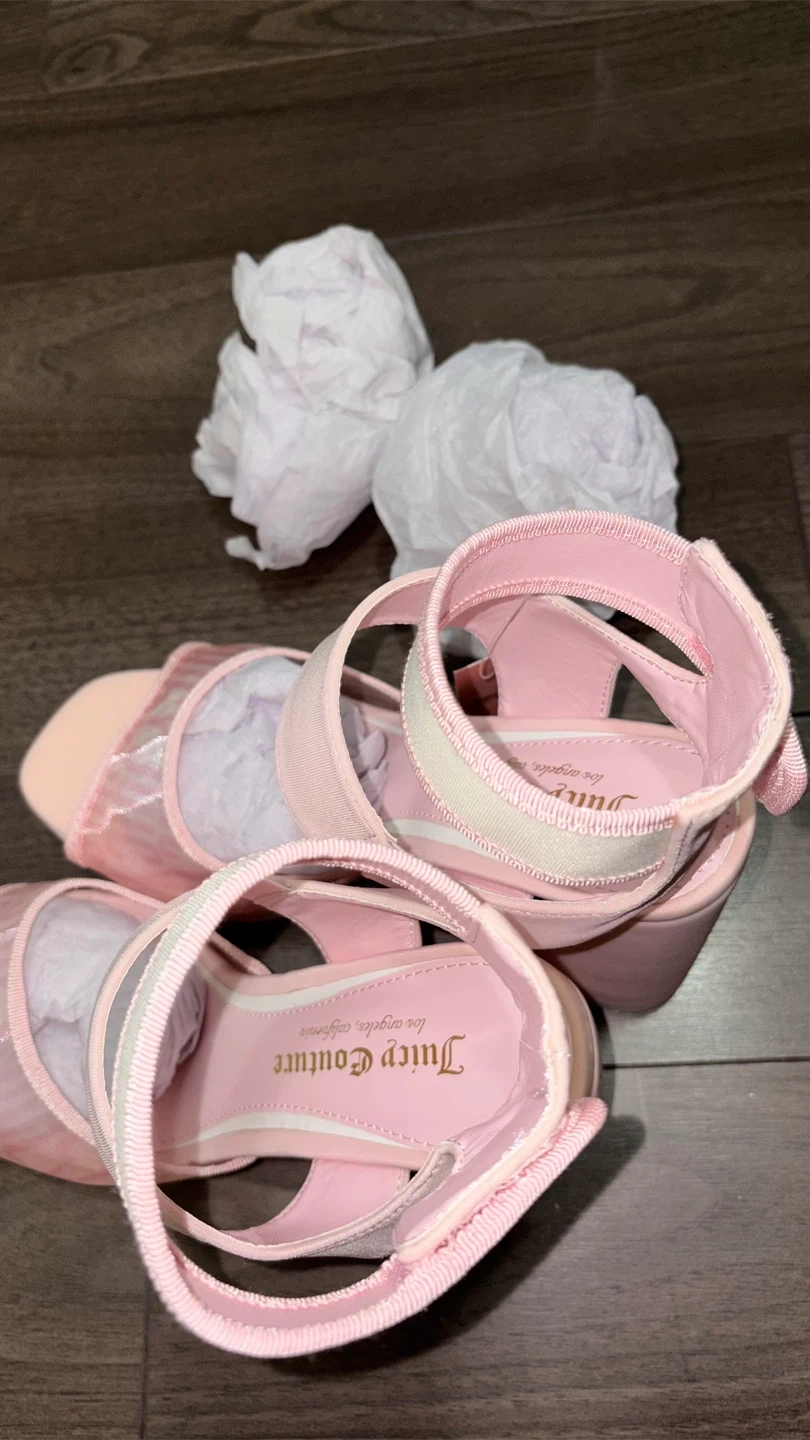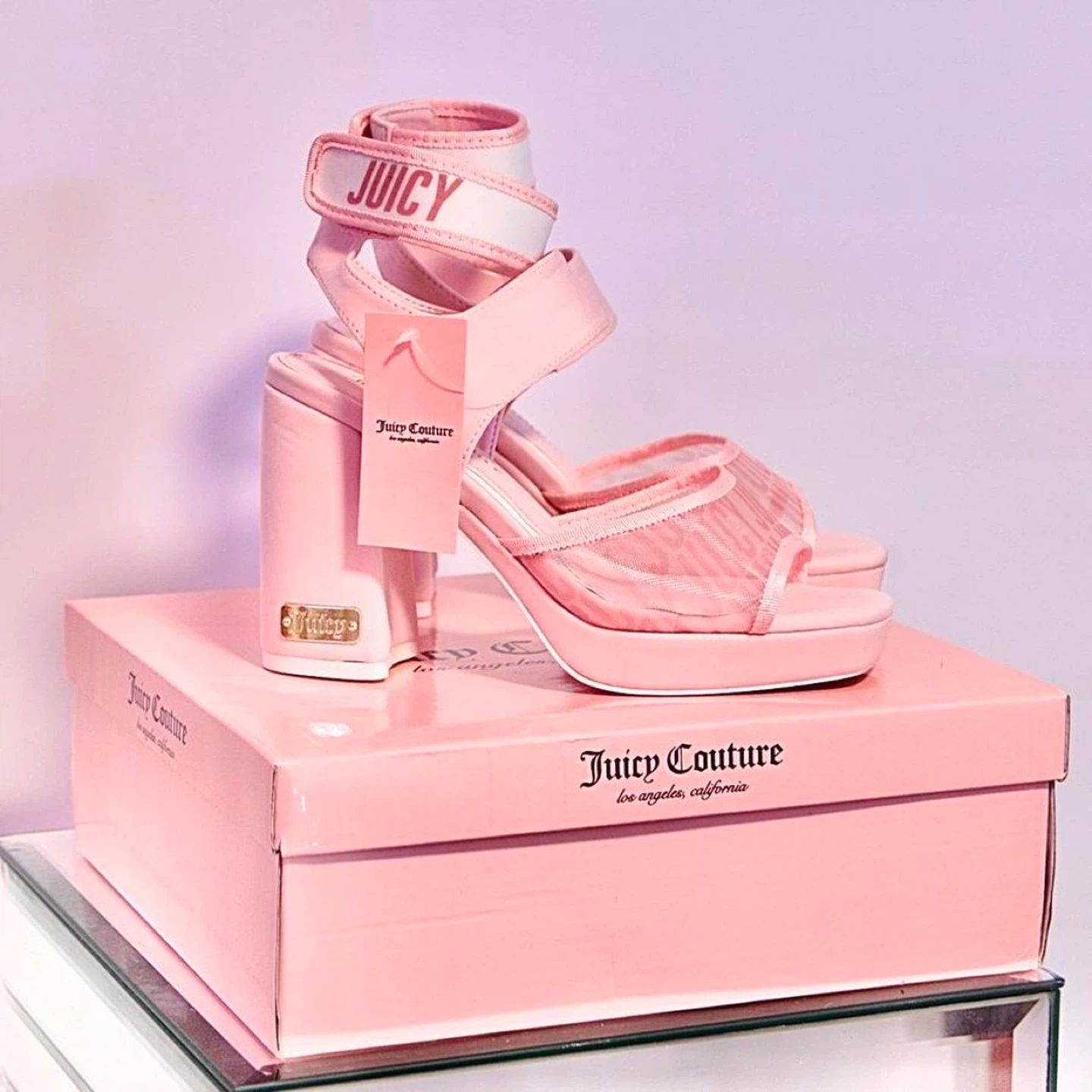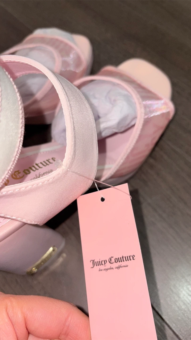 These Juicy Couture sandals are a cute shade of pink! Theyre known by Juicy Couture Graciela Baby Pink Mesh Open Toe Heels. They’re brand new and come with tag and juicy couture original box. They're made with mesh and neoprene material. Size 7.5. Comes with the box and tissue paper. A beautiful gift for you.