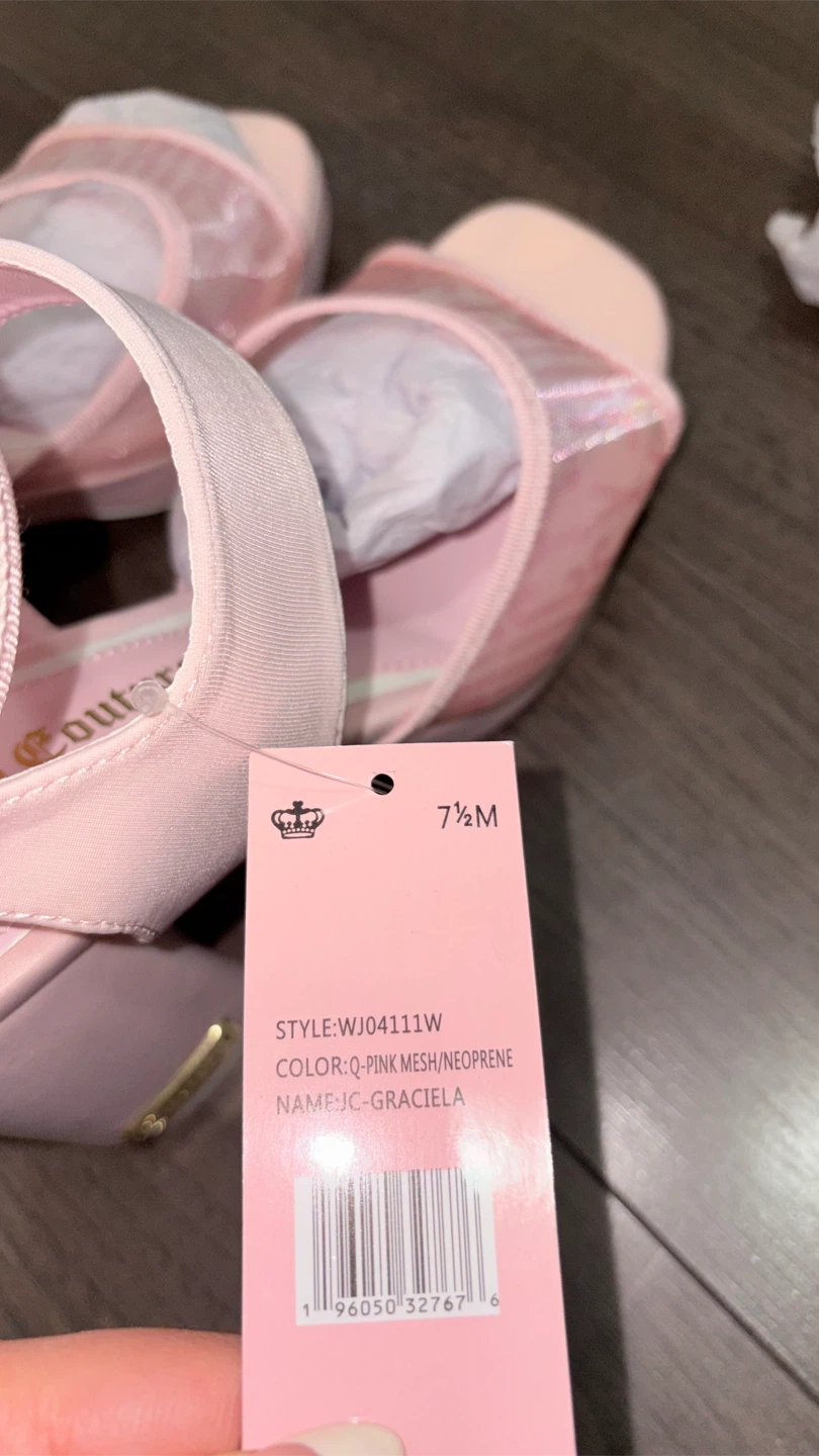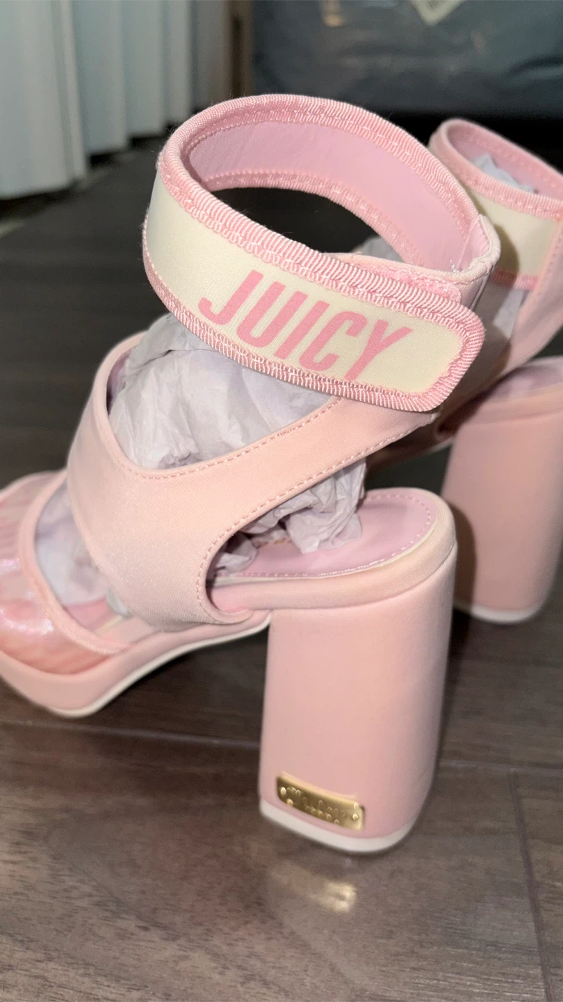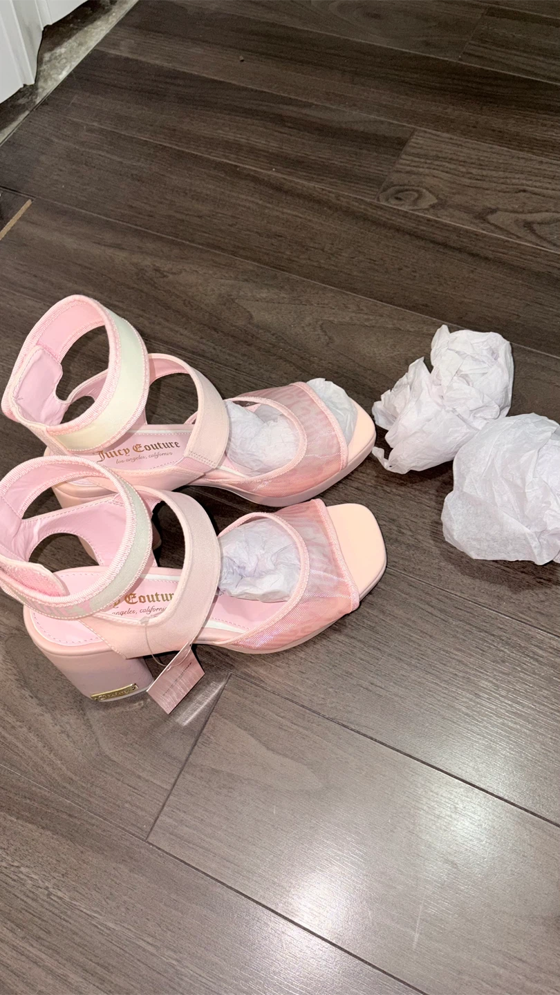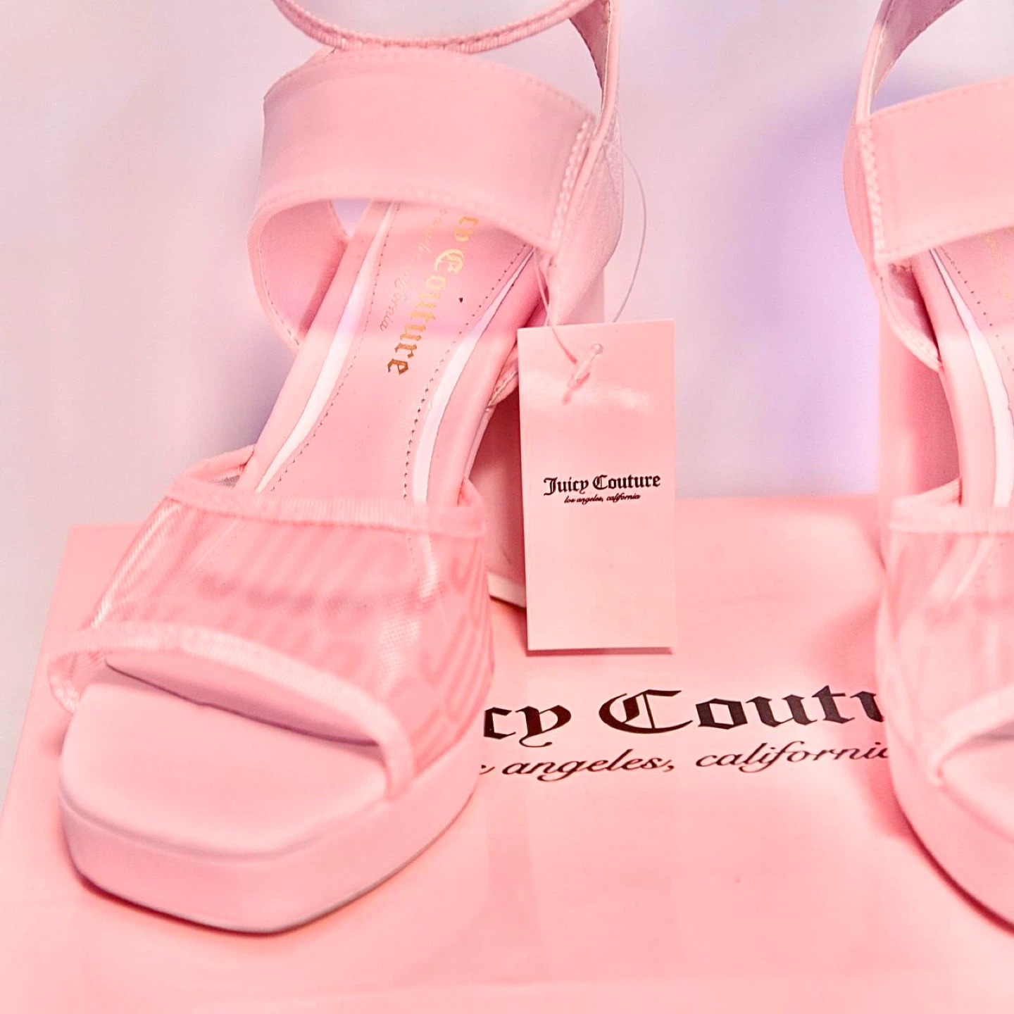 These Juicy Couture sandals are a cute shade of pink! Theyre known by Juicy Couture Graciela Baby Pink Mesh Open Toe Heels. They’re brand new and come with tag and juicy couture original box. They're made with mesh and neoprene material. Size 7.5. Comes with the box and tissue paper. A beautiful gift for you.