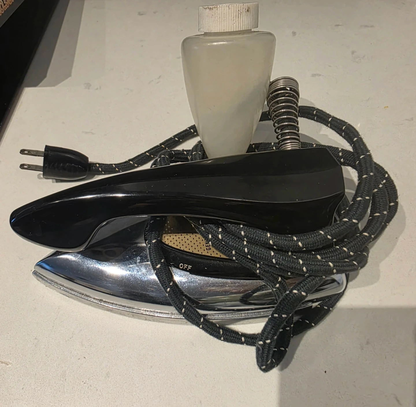 This is a vintage steam iron in black with a chrome soleplate. It includes a plastic water bottle for steam function. The cord is fabric-wrapped. The iron has an 'OFF' setting indicator.