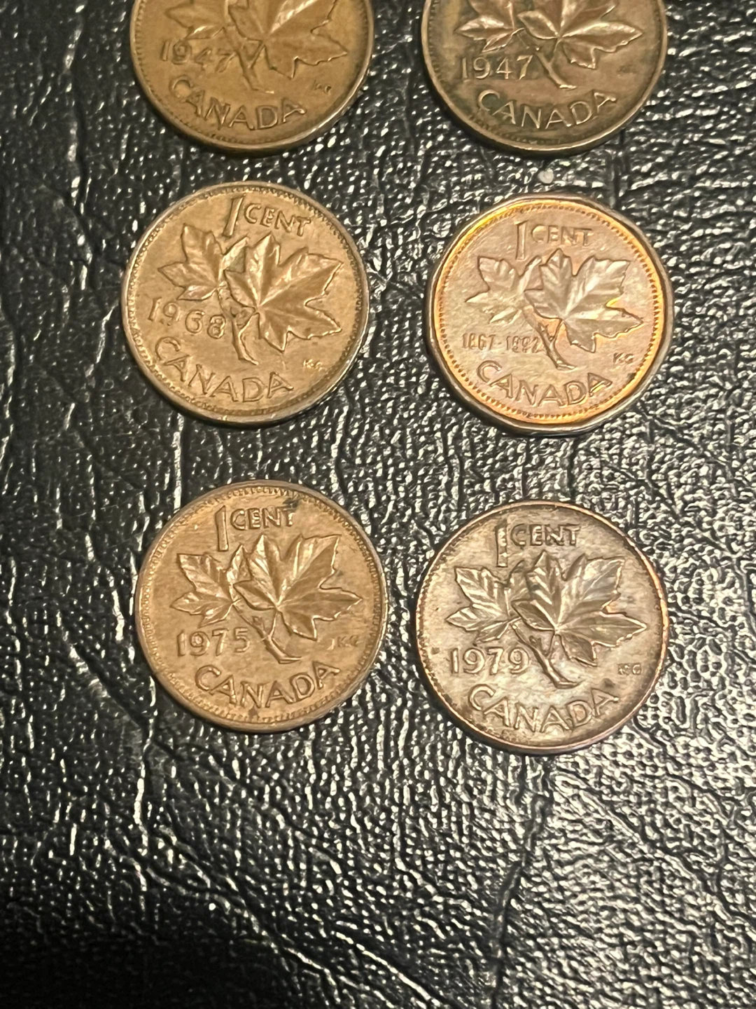 Collection of Canadian pennies featuring various years and designs. Includes coins from King George VI and Queen Elizabeth II eras. Years visible include 1947, 1965, 1975, and 1979. Some coins show the bird emblem while others display the maple leaf. Great for coin enthusiasts or starting a collection! 1867 too!