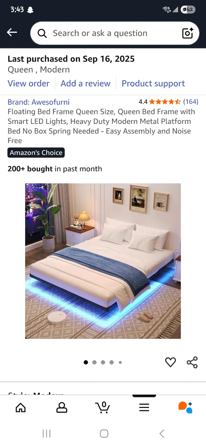 10Selling a queen-sized floating bed frame by Awesofurni! It features smart LED lights and a heavy-duty modern metal platform. It's designed for easy assembly and is noise-free. Last purchased on September 16, 2025
