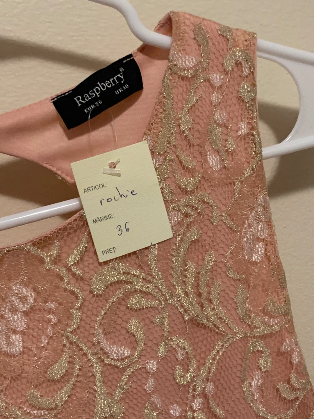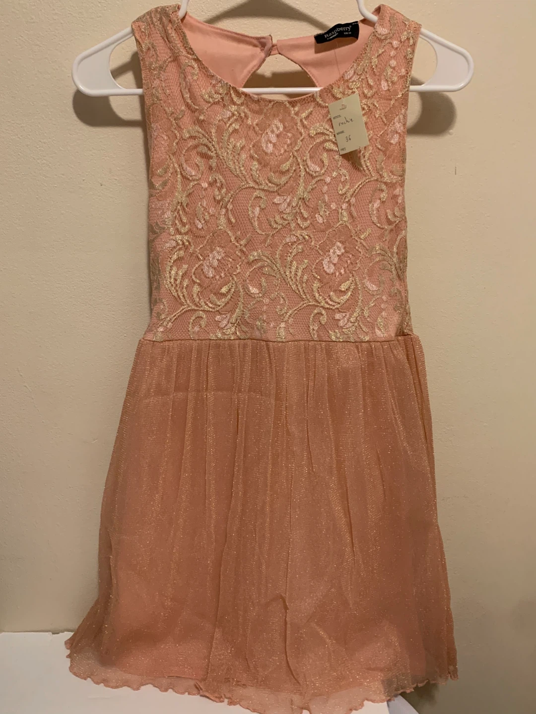 This brand new with tag Raspberry dress features a pink lace bodice with gold accents and a shimmering pink tulle skirt. It has a keyhole back closure. Size UK 10 or EUR 36.