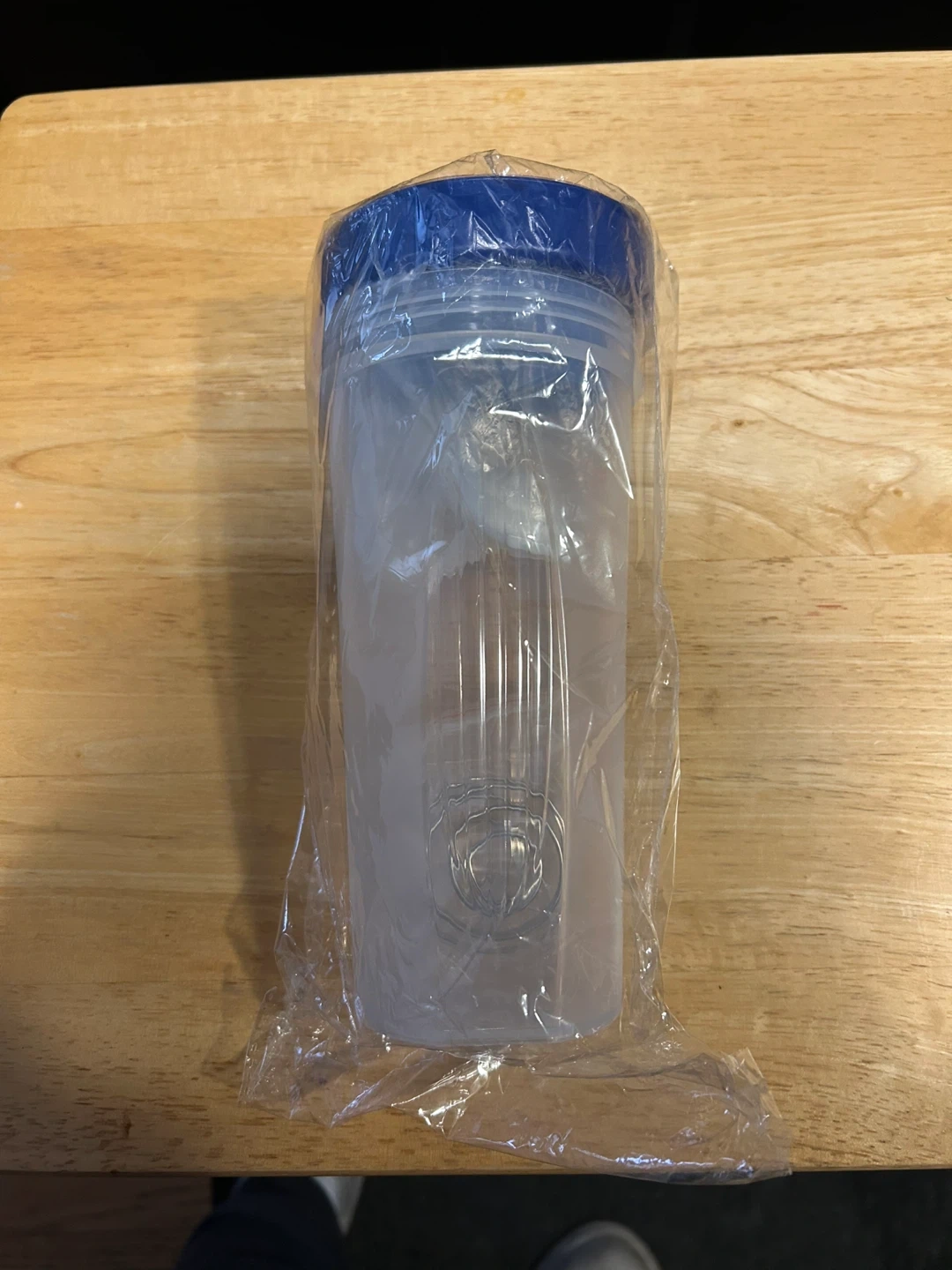 This is a blue shaker bottle, great for mixing protein shakes or other beverages. It's clear and has a secure lid. Perfect for taking your drinks on the go!