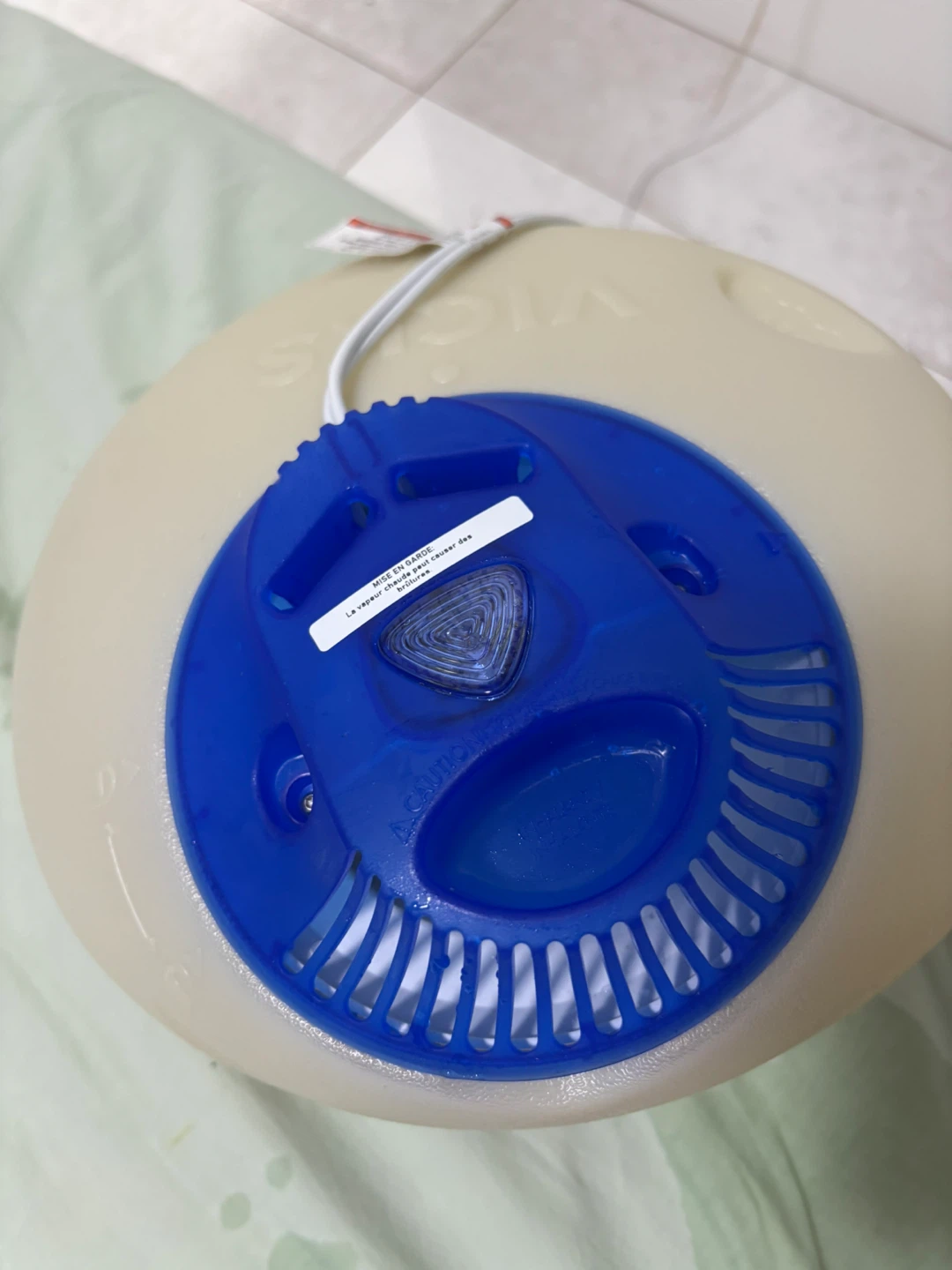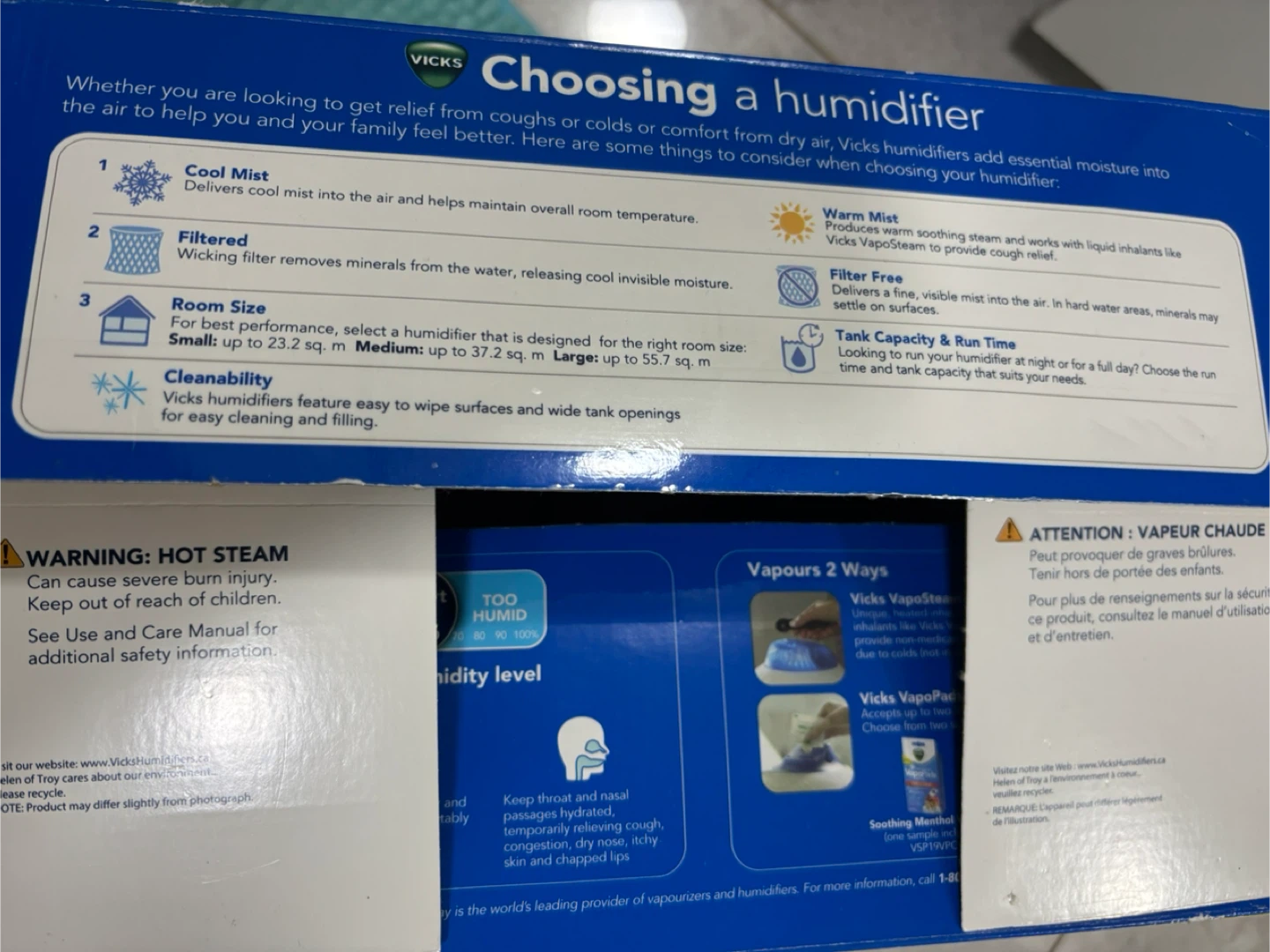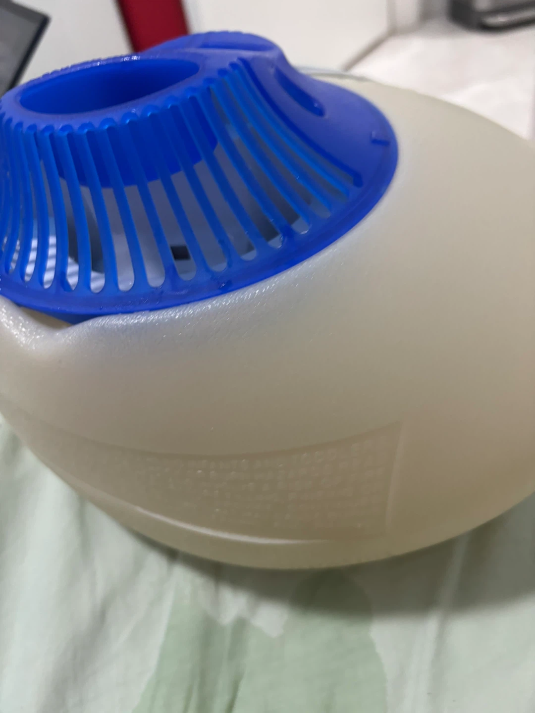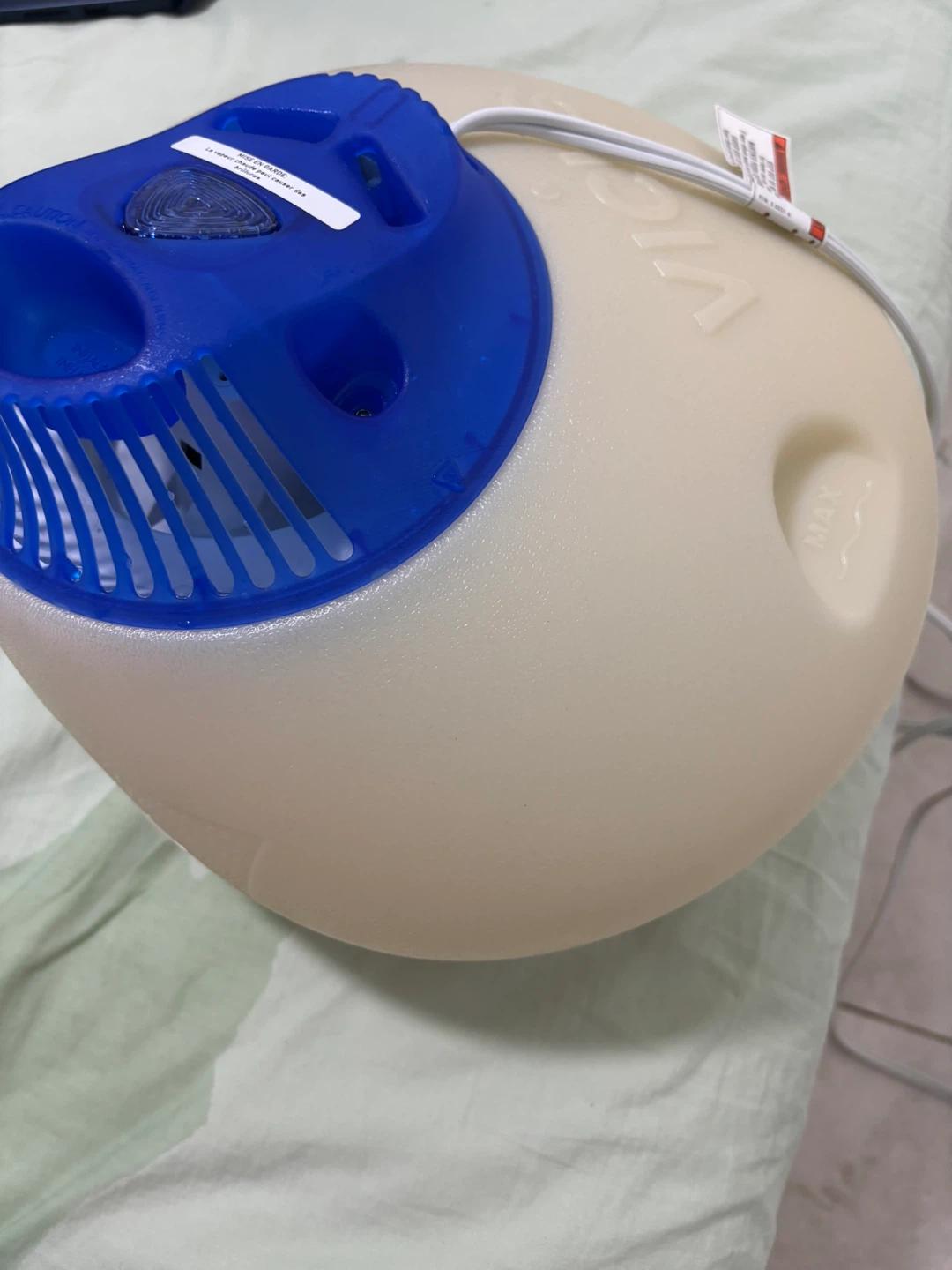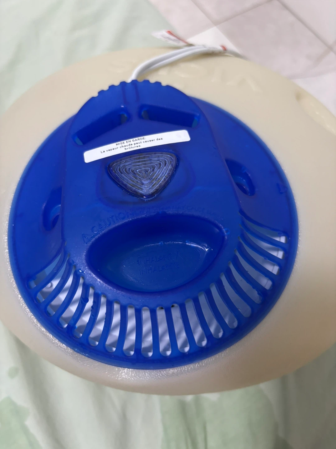 A Vicks humidifier with a blue top. It's a lightweight plastic design. This device is for adding moisture to the air.