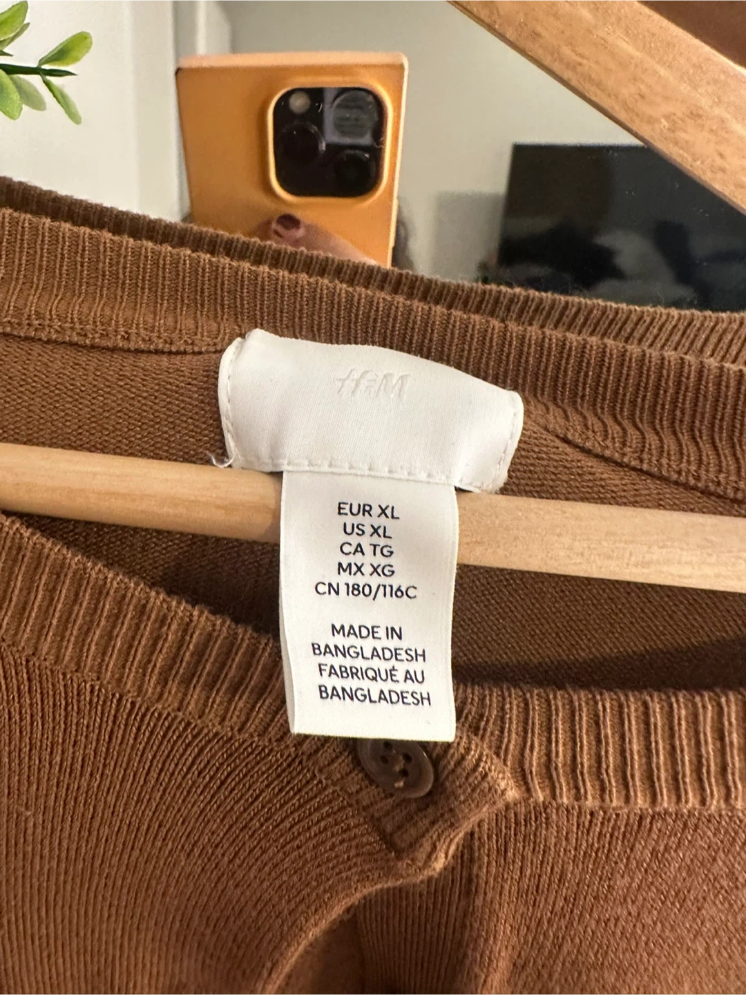This is an H&M brown button-up cardigan sweater. It's a size XL, with EUR XL, US XL, CA TG, and MX XG sizing. Made in Bangladesh. It's a great layering piece for cooler weather!