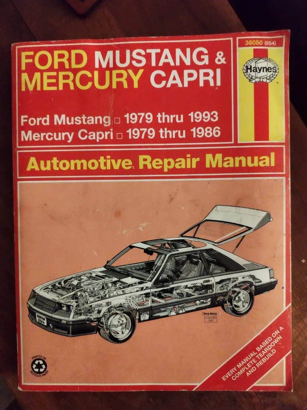 This Haynes automotive repair manual covers Ford Mustang models from 1979 through 1993 and Mercury Capri models from 1979 through 1986. It's based on a complete teardown and rebuild. Printed on recycled paper.
