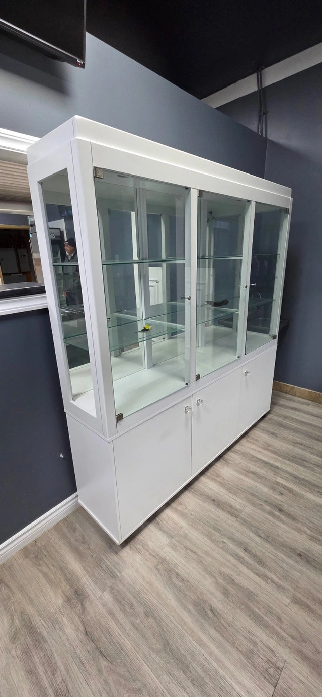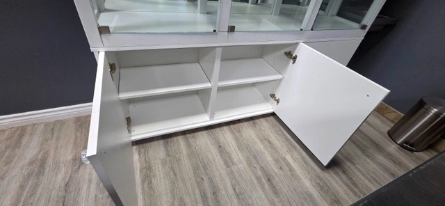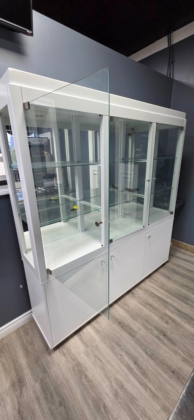 Modern white retail display cabinet with tempered glass shelves and lockable glass doors. Perfect for shops, salons, bakeries, or home business use. Spacious glass display section with multiple shelves. Bottom cabinets for extra storage. Clean white finish – looks professional in any space. Sturdy construction and well maintained. Ideal for showcasing products, food items, or collectibles. Dimensions: Length: 71 inches (approx. 6 feet), Height: 75 inches (over 6 feet tall), Depth: 15.5 inches (slim profile, great for hallways or smaller rooms). Condition: Very good, ready to use. Cash accepted.