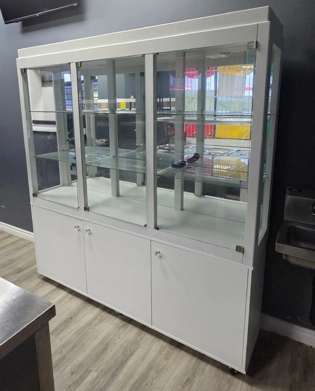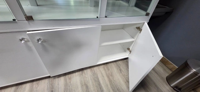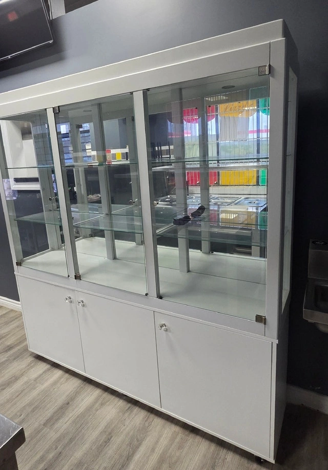 Modern white retail display cabinet with tempered glass shelves and lockable glass doors. Perfect for shops, salons, bakeries, or home business use. Spacious glass display section with multiple shelves. Bottom cabinets for extra storage. Clean white finish – looks professional in any space. Sturdy construction and well maintained. Ideal for showcasing products, food items, or collectibles. Dimensions: Length: 71 inches (approx. 6 feet), Height: 75 inches (over 6 feet tall), Depth: 15.5 inches (slim profile, great for hallways or smaller rooms). Condition: Very good, ready to use. Cash accepted.
