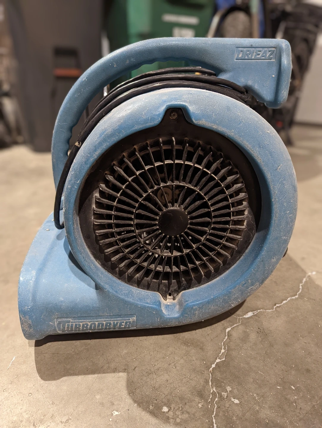 This is a Dri-Eaz TurboDryer B42 commercial air mover. It features a heavy-duty plastic housing and a built-in cord wrap. This unit is great for drying carpets or circulating air.