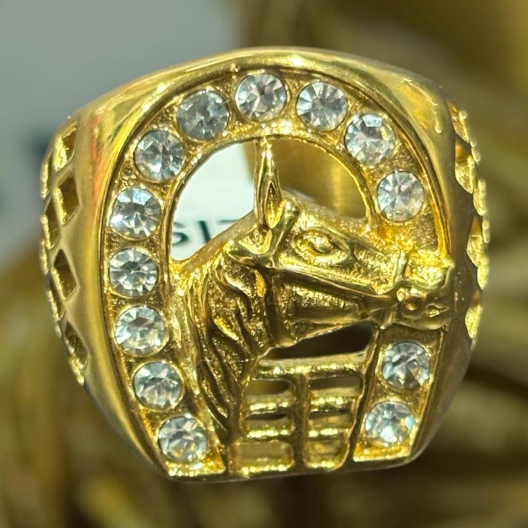 Men's gold ring. Features a horseshoe with a horse's head and clear cubic zirconia stones. Stylish and eye-catching.