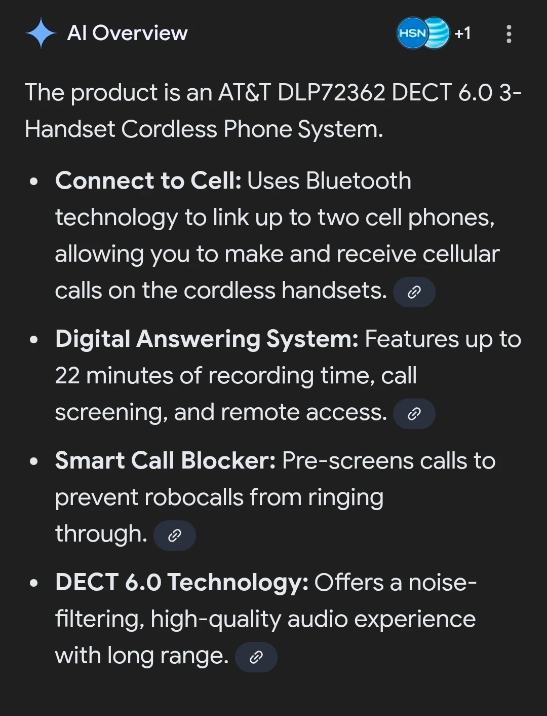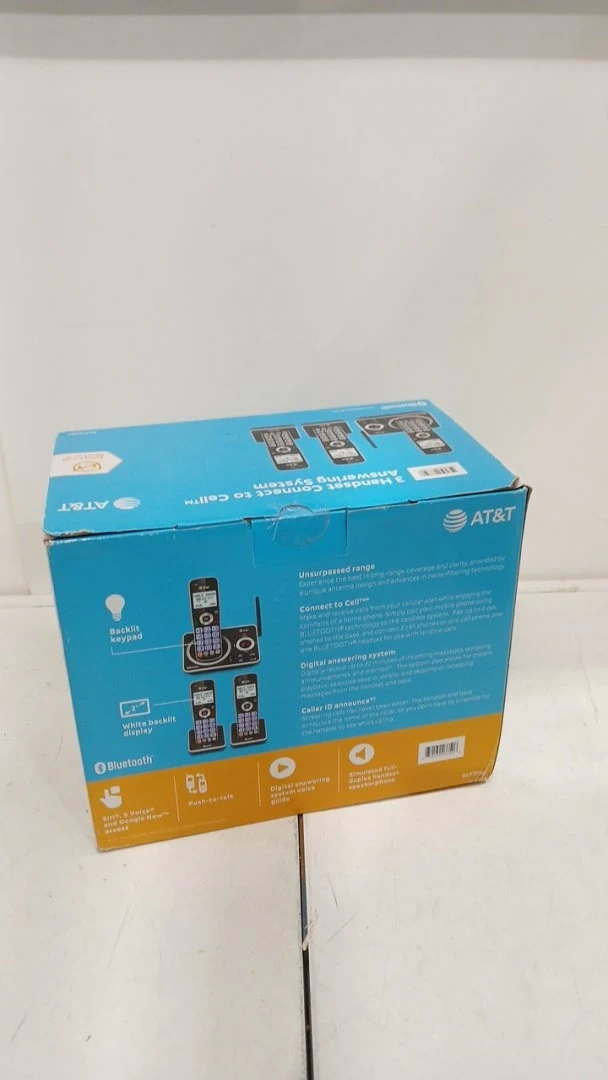 This AT&T DLP72362 DECT 6.0 3-Handset Cordless Phone System is Brand New and ready to connect! This system uses Bluetooth technology to link up to two cell phones, allowing you to make and receive cellular calls on the cordless handsets. The digital answering system features up to 22 minutes of recording time, call screening, and remote access. With a smart call blocker, it pre-screens calls to prevent robocalls from ringing through.