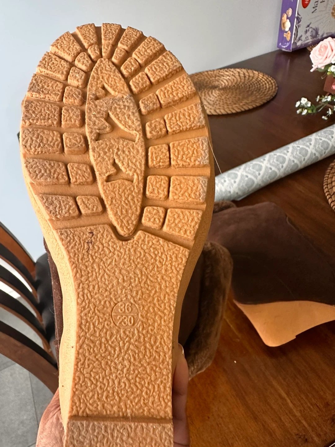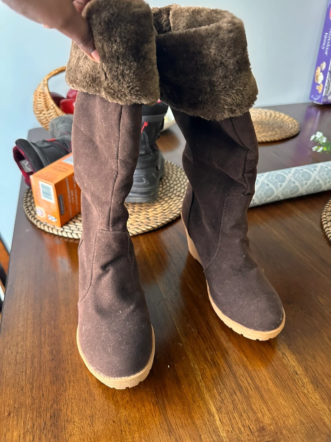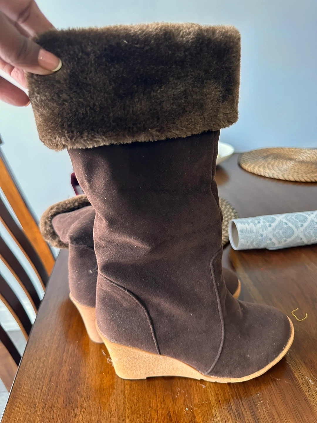 Cozy up this winter with these stylish brown boots! They're a size 6 and feature a faux fur trim for extra warmth and comfort. Perfect for those chilly Canadian days!