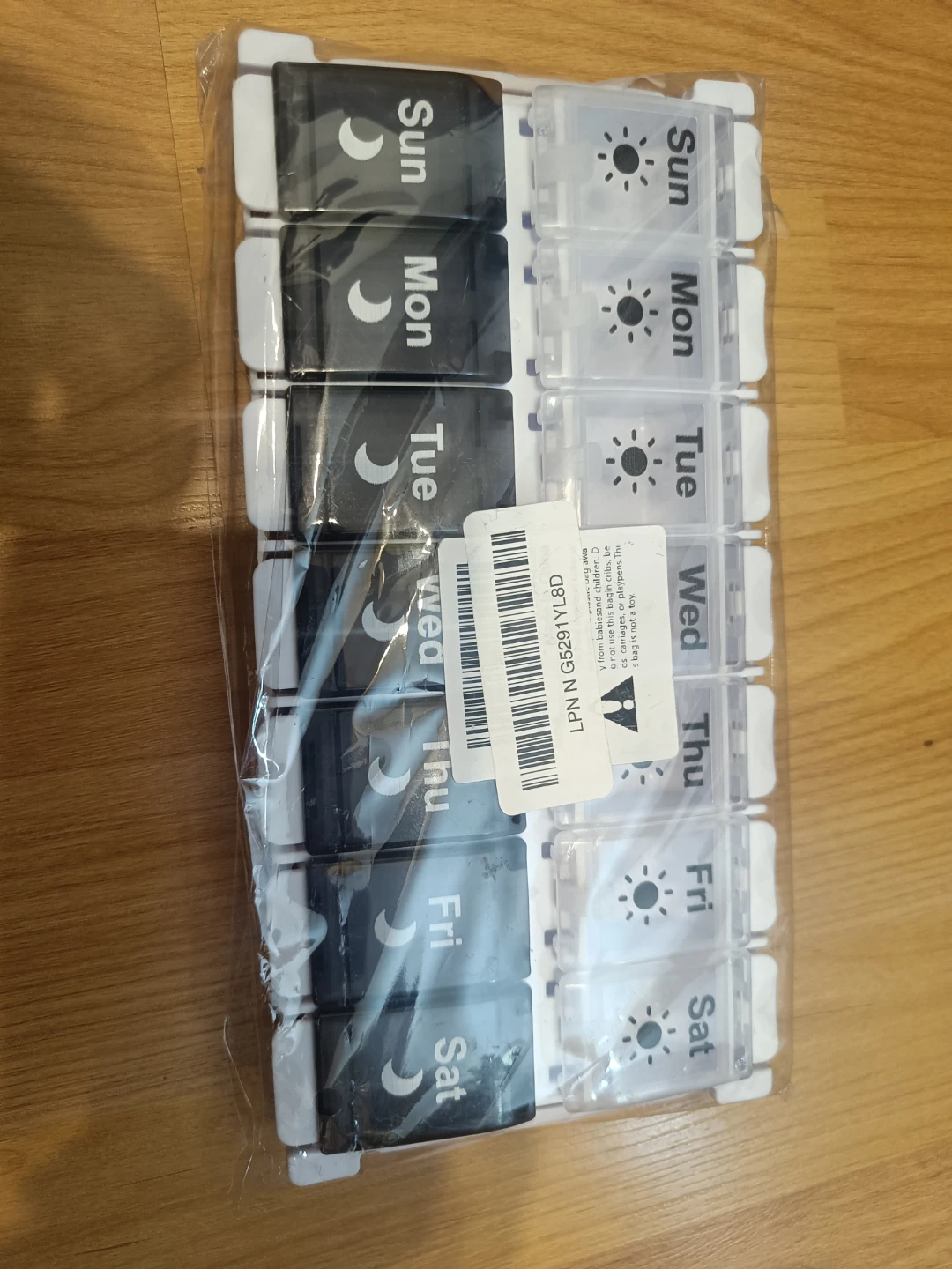 This is a 7-day pill organizer for morning and evening doses. Each compartment is clearly labelled with the day of the week. It's designed for easy access to your daily medication.
