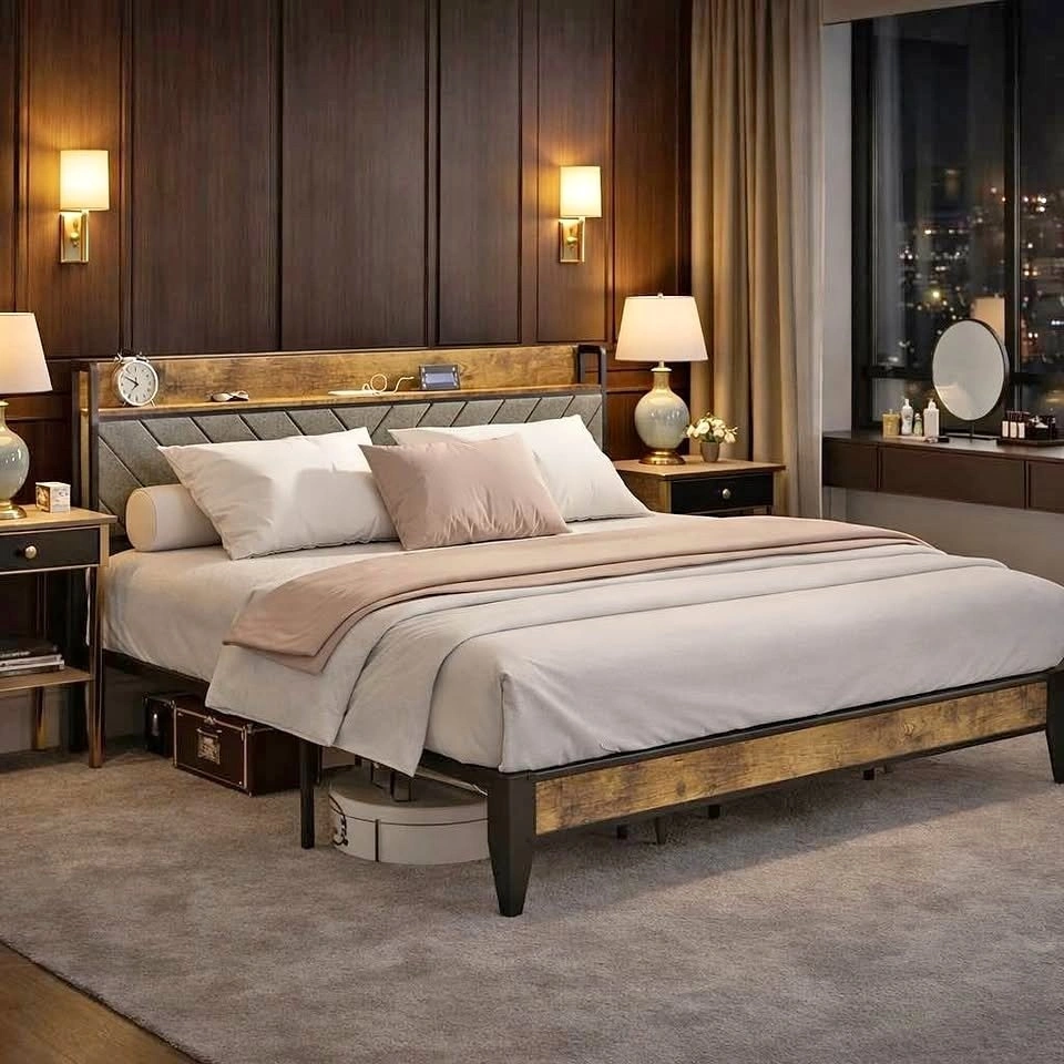 Upholstered Headboard Bed with Charging, Storage Shelf - Queen/K