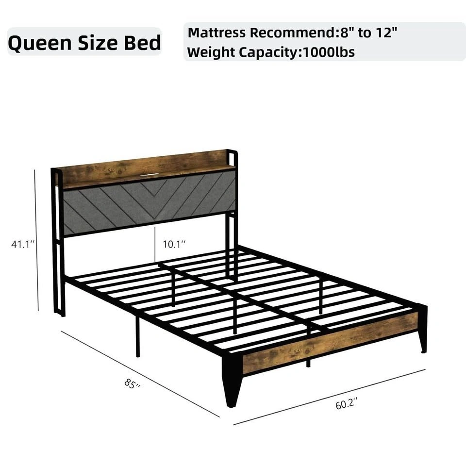 Brand new in box. Available in Queen for $150 (tax included) and King for $175. Smart storage headboard with compartments and 2 USB ports. Features an LED night light. 11” underbed clearance for storage. Heavy-duty build with metal slats and reinforced legs, supports up to 1000 lbs. Cozy linen fabric upholstery with memory foam headboard. Easy setup, ready in about 40 minutes.