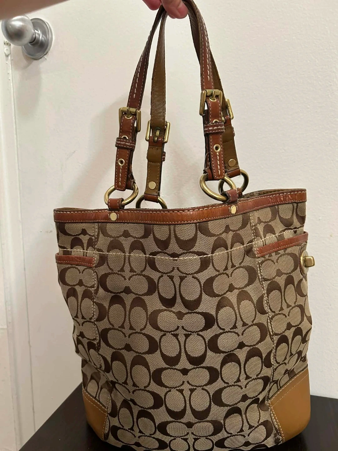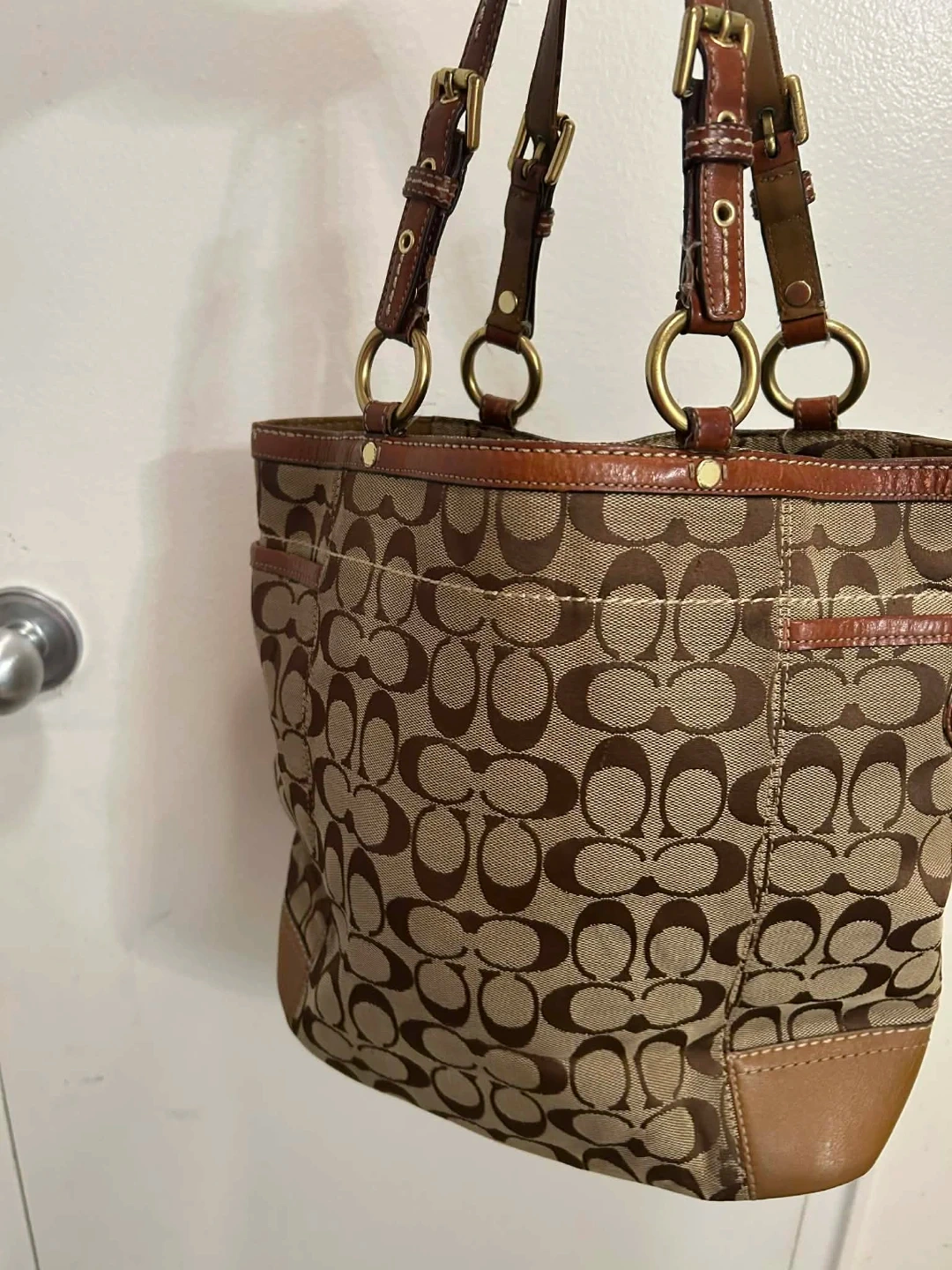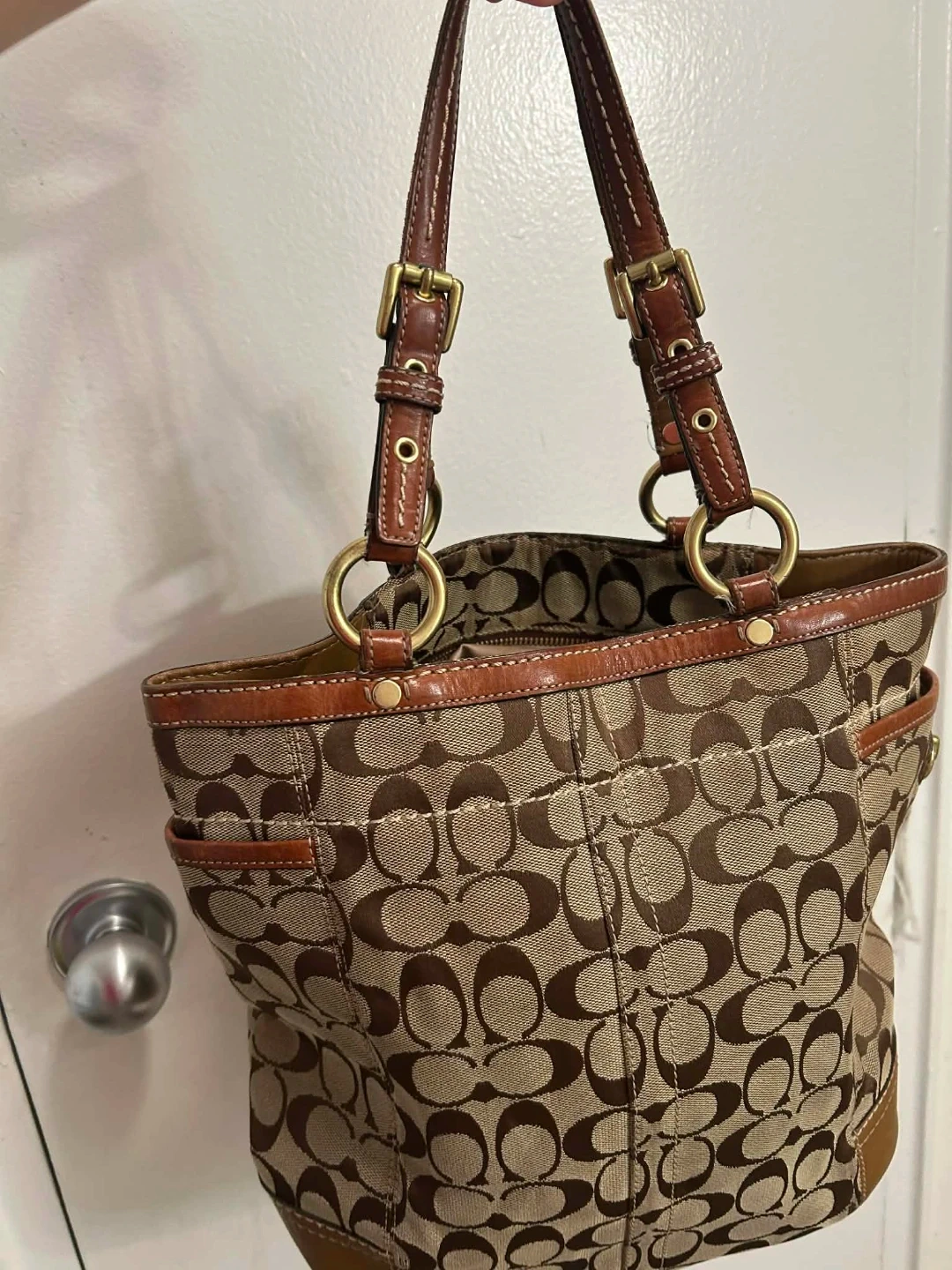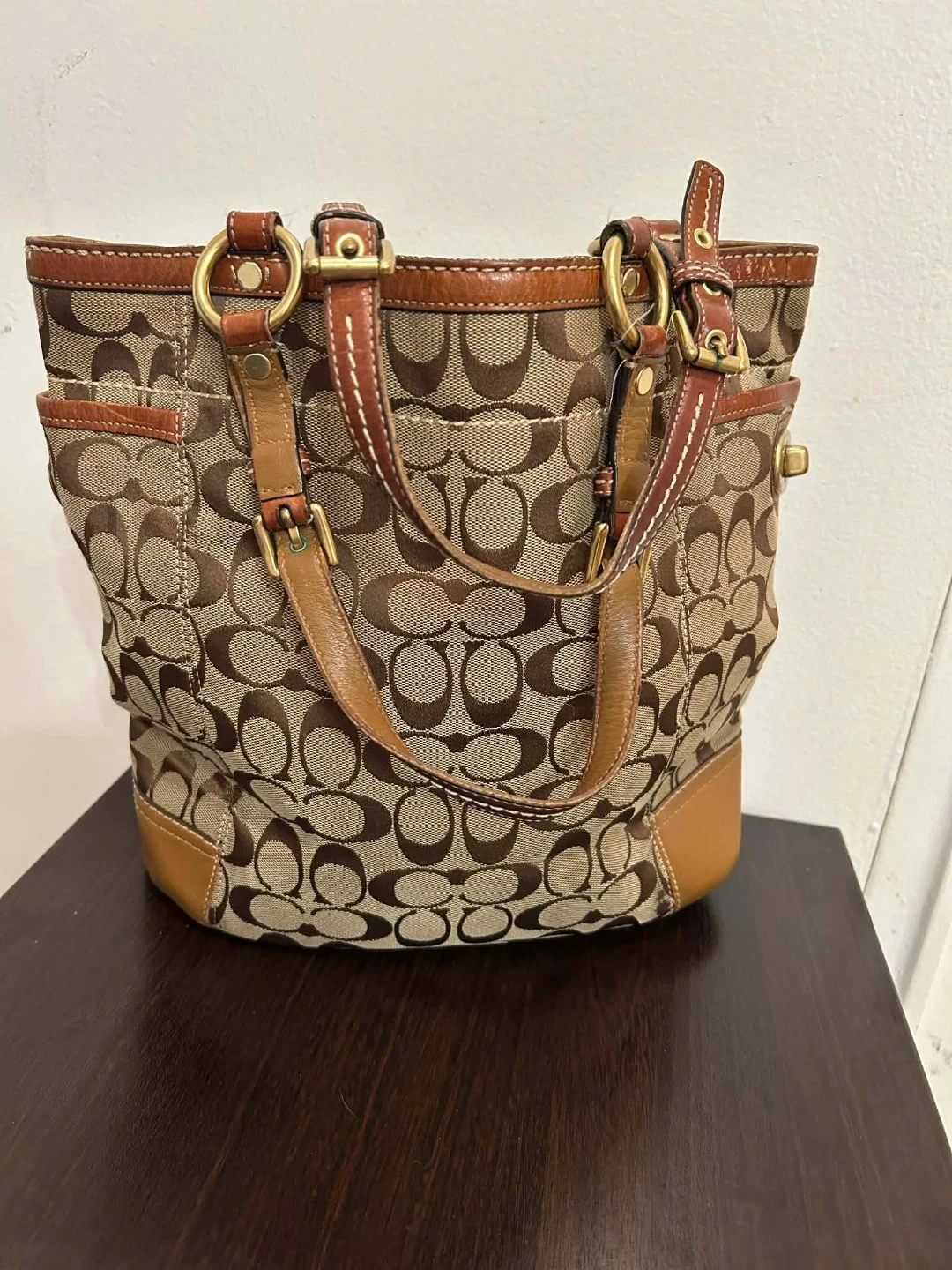 A stylish Coach tote bag in their signature monogram print. It's made with a combination of canvas and leather trim. Features multiple exterior pockets for easy access. This bag is perfect for everyday use! There is a stain in bottom part and Just needs cleaning .