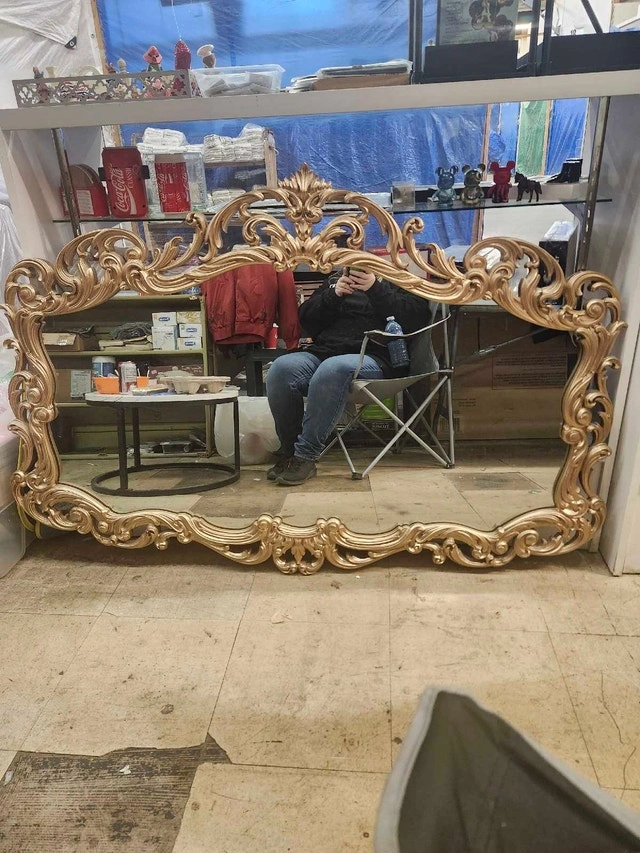 Add a touch of elegance to your home with this ornate mirror, perfect as a decorative statement piece. Please note that this is a used item, showing some signs of wear, which adds to its vintage charm. Ready to find a new home where it can reflect its unique character! If the ad is up, it's still available! 49 and a half inches wide 34 inches high. Cash accepted.