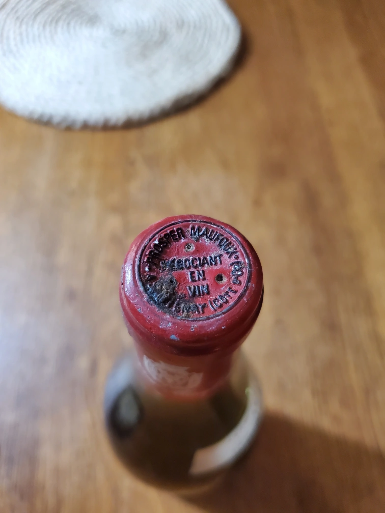 Selling a vintage bottle of Beaujolais-Villages Vin Primeur from 1985. It's a red table wine, bottled by Prosper Maufoux. Sole agents for Ontario: John Hanna & Sons Ltd.