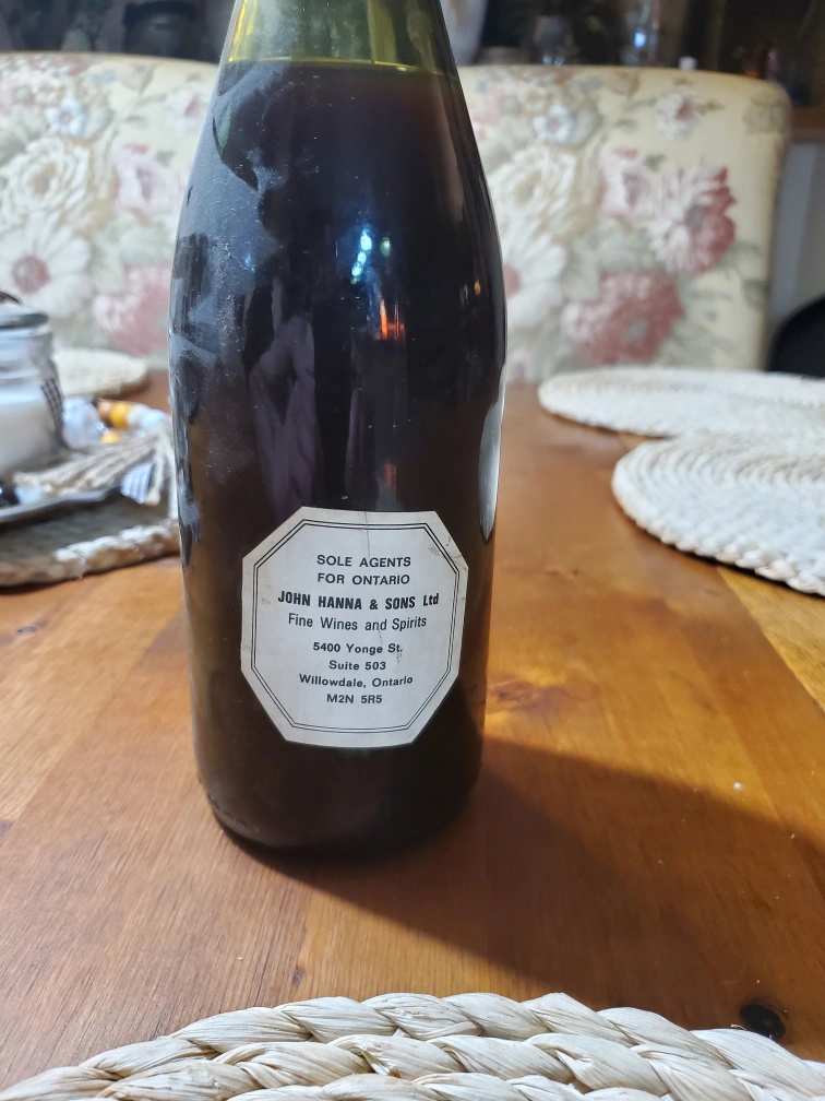 Selling a vintage bottle of Beaujolais-Villages Vin Primeur from 1985. It's a red table wine, bottled by Prosper Maufoux. Sole agents for Ontario: John Hanna & Sons Ltd.